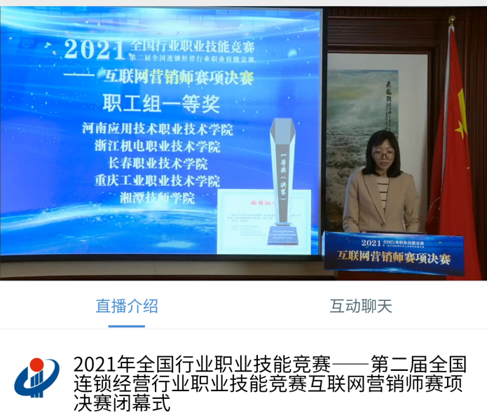 11月13日,2021年全国行业职业技能竞赛——第二届全国连锁经营行业职业技能竞赛首届互联网营销师赛项全国总决赛圆满落幕。我校商学院教师吴昀以总分第一名的成绩获得职工组一等奖。根据竞赛规程,职工组决赛前3名的选手,在报请人力资源和社会保障部核准后,将授予“全国技术能手”荣誉称号。