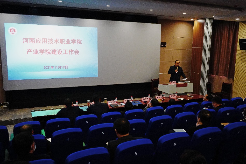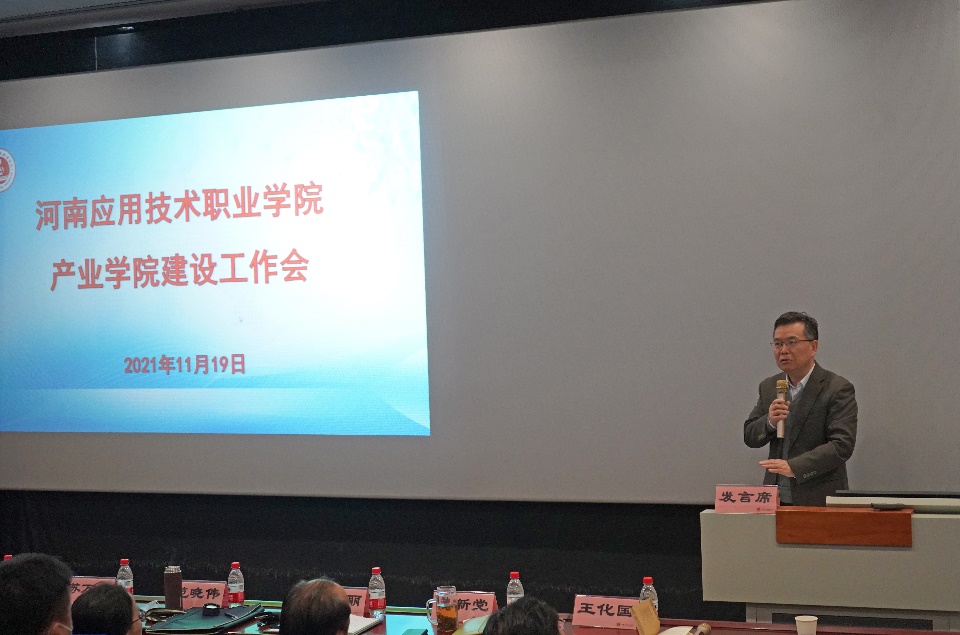 为贯彻国家有关战略要求,落实《国务院办公厅关于深化产教融合的若干意见》和国家《职业教育改革实施方案》等文件精神,推进现代产业学院建设工作。2021年11月19日上午,我校召开产业学院建设工作会。校长范晓伟,副校长陈君丽、魏新华、刘振民,总督学苏万益,河南机电职业技术学院发展与合作处处长王化国出席会议,相关职能部门负责人及各二级学院党政负责人参加会议。会议由副校长薄新党主持。