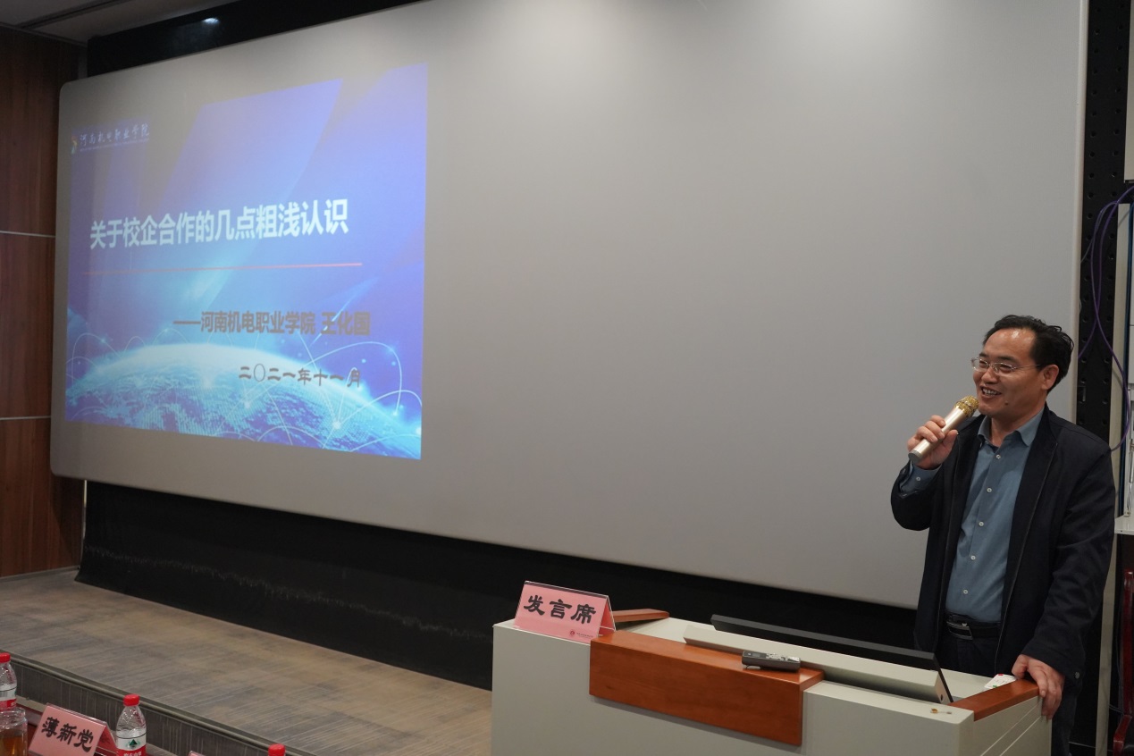 河南机电职业技术学院发展与合作处处长王化国结合河南机电职业技术学院产业学院建设的情况进行了阐述:一是职业教育为什么要进行校企合作;二是怎样才能做好校企合作;三是校企合作普遍存在的认识问题;四是对产业学院的理解。并对我校产业学院建设工作进行了点评和指导,随后我校校领导、各二级学院院长与王化国处长就我校目前产业学院建设情况作了深入交流。