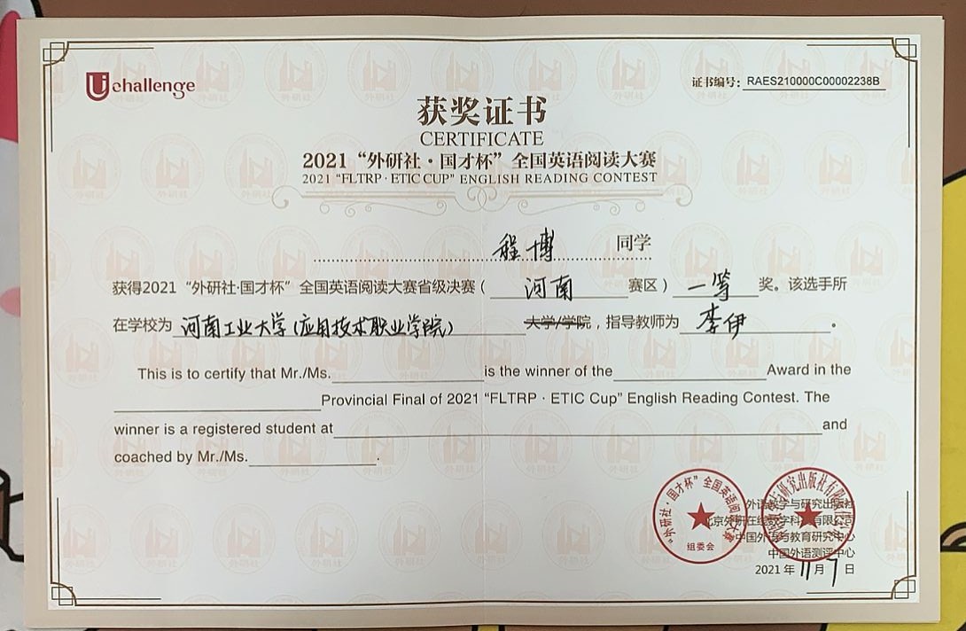 11月6日,2021年“外研社·国才杯”全国英语演讲、写作、阅读比赛河南省赛通过线上举行。来自郑州大学、河南大学等55所高校,共计454名本科选手参加了此项赛事,我校本科部6位参赛选手在本次大赛中脱颖而出,取得优异成绩。