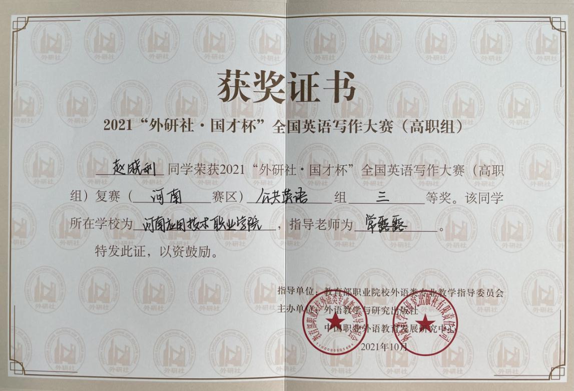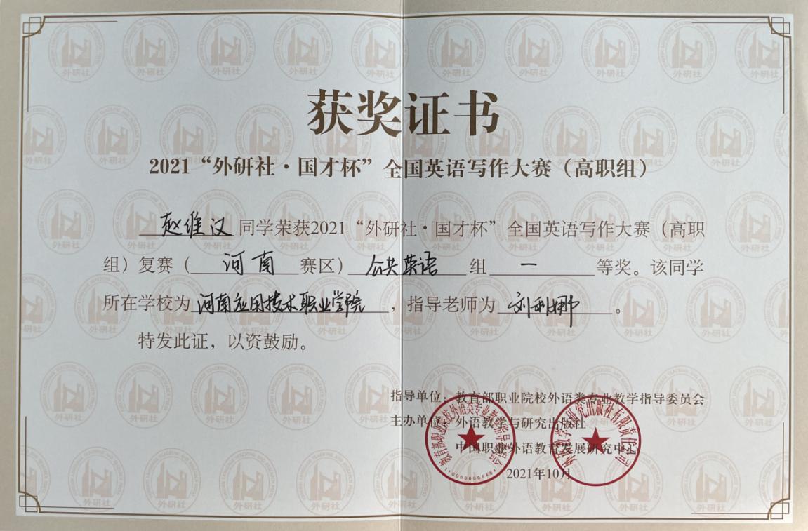 10月24日,2021“外研社·国才杯”全国英语写作大赛(高职组)河南赛区比赛,在黄河水利职业技术学院顺利进行。我校学生赵维汉、赵晓利两位同学沉着参赛,在基础部英语老师刘利娜、常露露的精心指导下,以精彩的表现“秀”出英语的魅力,展示扎实的写作水平。经过激烈角逐,力压群雄,分别荣获公共组一等奖和三等奖的优异成绩。