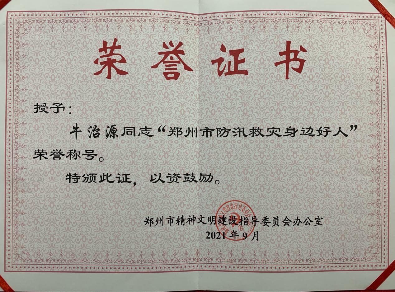 牛治源说:“历了这次灾情,参与了这次救援,我看到了什么是一方有难,八方支援;看到了什么是“人民的力量”;更明白了新时代大学生肩上所担负的使命与责任。大家众志成城,齐心抗洪,心往一处想,劲往一处使,就能战胜一切困难。根据郑州市精神文明建设指导委员会办公室文件精神,选树牛治源同志为“郑州市防汛救灾身边好人”。