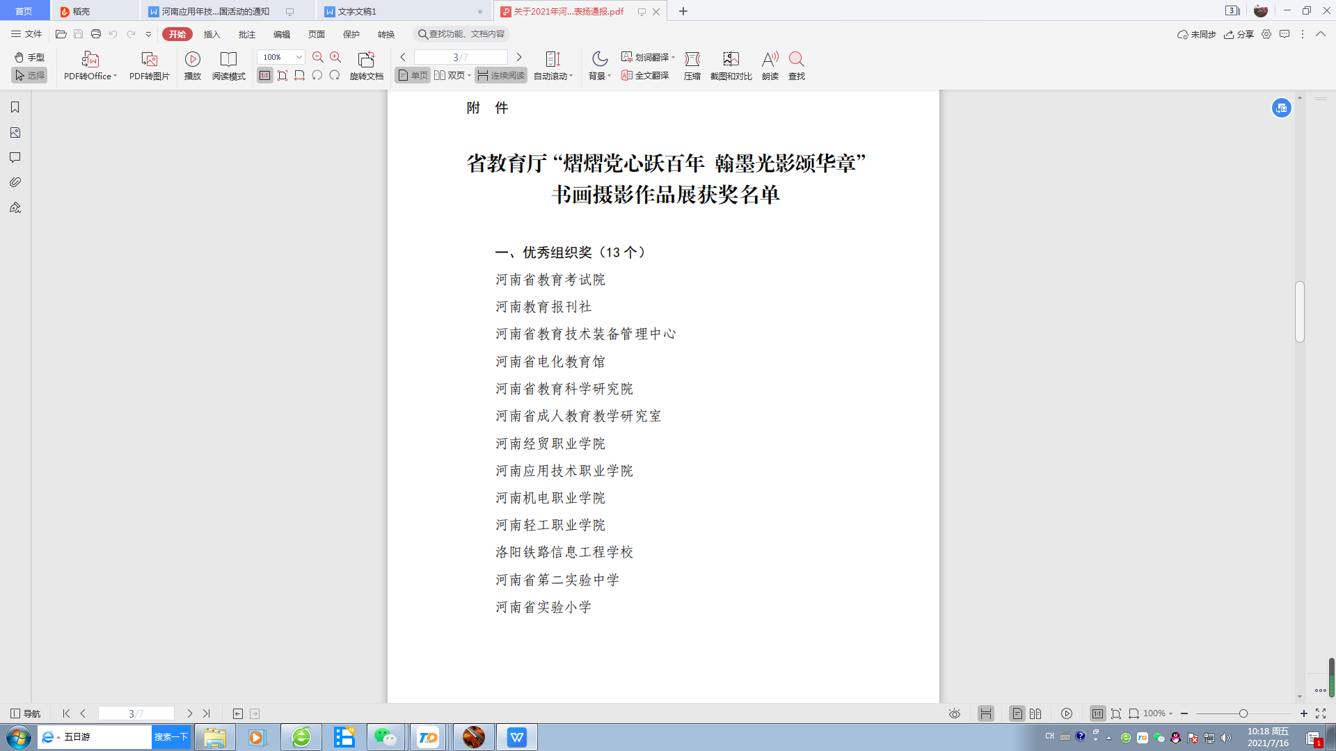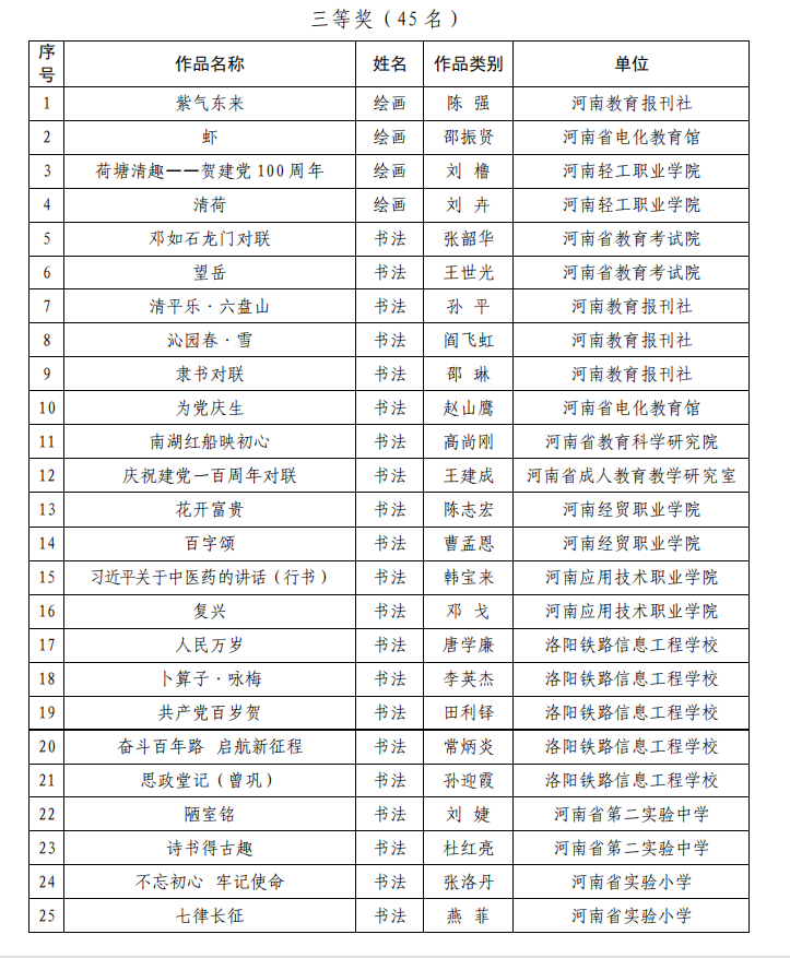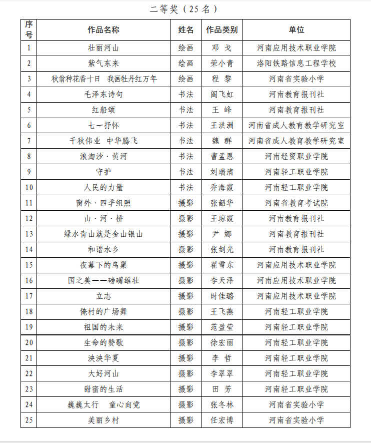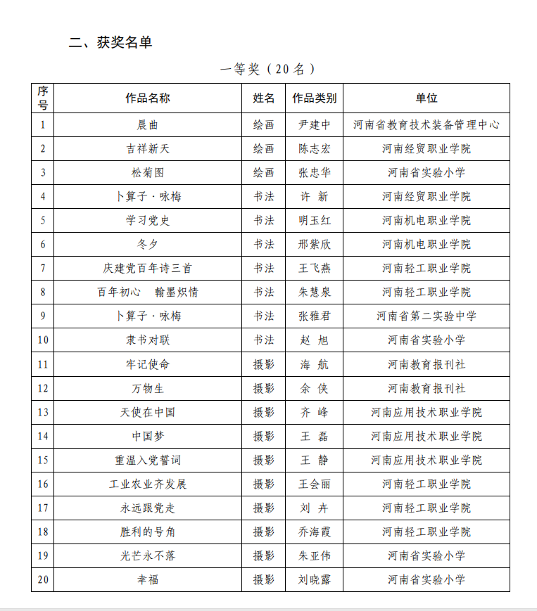 近日,在河南省教育厅公布的“熠熠党心跃百年 翰墨光影颂华章”书画摄影作品展中,我校教职工作品共获得一等奖三项,二等奖四项,三等奖两项,我校被表扬通报获得优秀组织奖。
