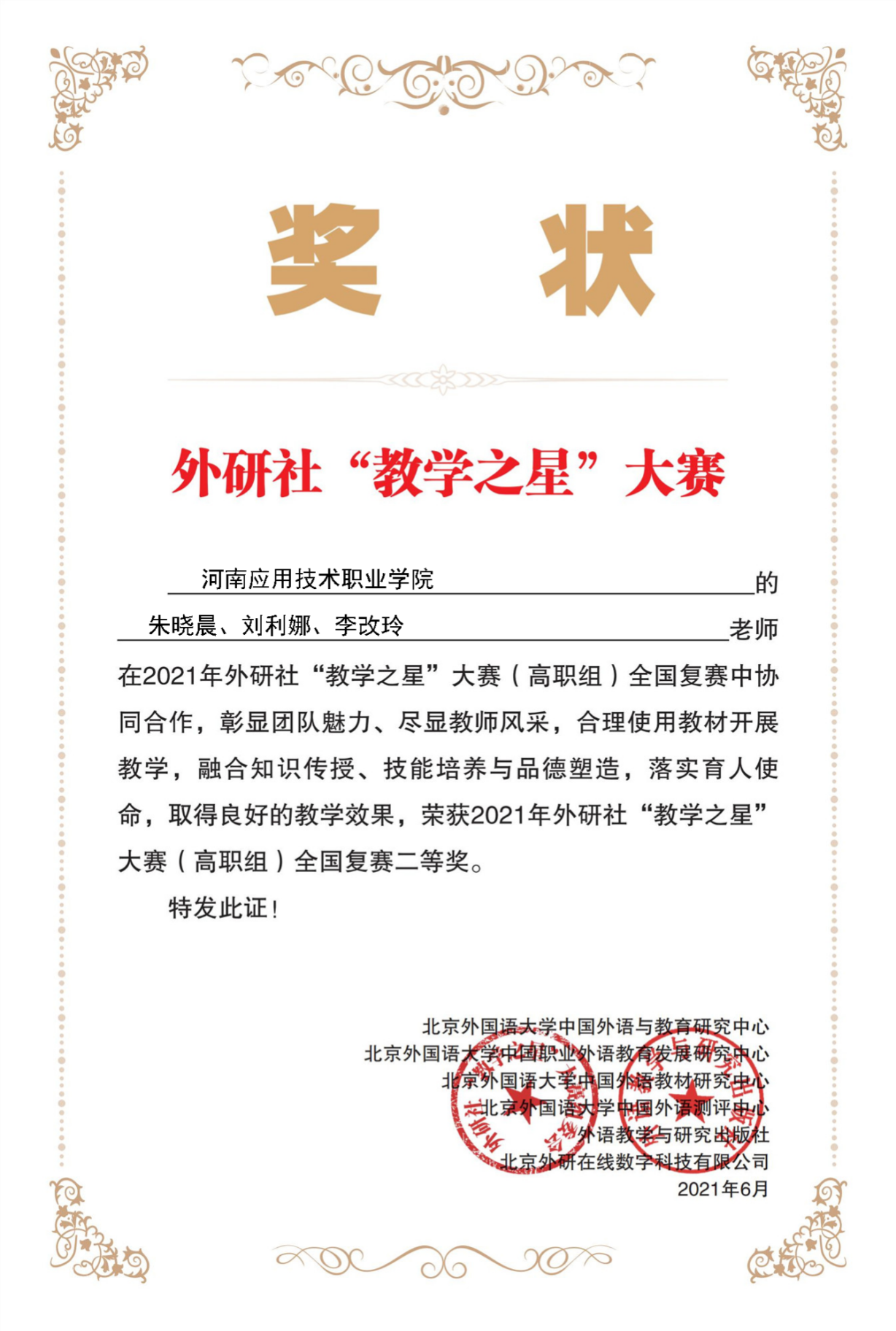 日前,2021年外研社“教学之星”大赛全国复赛落下帷幕,我校教师朱晓晨、刘利娜、李改玲3人组成的团队通过创新的教学设计方案和精彩的授课视频,获得全国复赛二等奖。