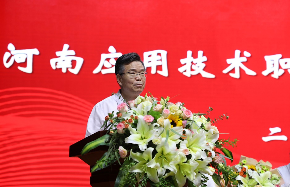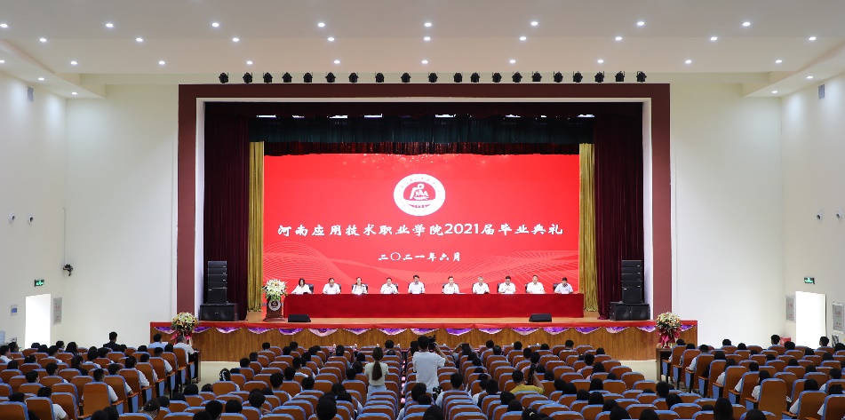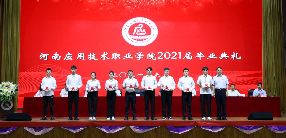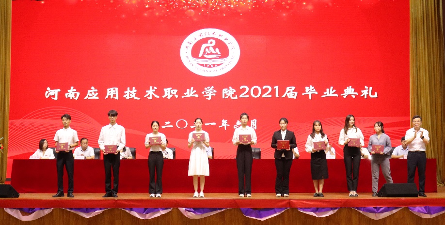 毕业典礼在庄严的国歌声中拉开帷幕。党委副书记蒋清民宣读了《河南省教育厅关于表彰2021年河南省优秀应届大中专毕业生的通知》、副校长陈君丽宣读了《河南应用技术职业学院关于准予张敬等5270名2021届学生毕业的决定》。党委书记闫俊山为2021届河南省普通大中专学校优秀毕业生代表颁发荣誉证书;校长范晓伟为2021届毕业生颁发毕业证书;党委副书记朱东方为2021届毕业生校友联络员代表颁发聘书。