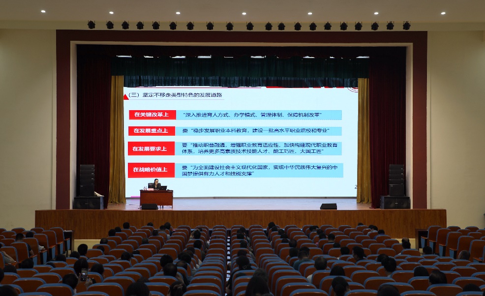 为深入学习习近平总书记的重要指示精神,贯彻落实全国职业教育大会的决策部署,推动学校职业教育的改革与发展,5月27日下午,我校在大学生活动中心召开全国职业教育大会精神宣讲会。副校长陈君丽作专题宣讲,副科级及以上干部、专业负责人、教研室主任参加会议,会议由副校长左智成主持。