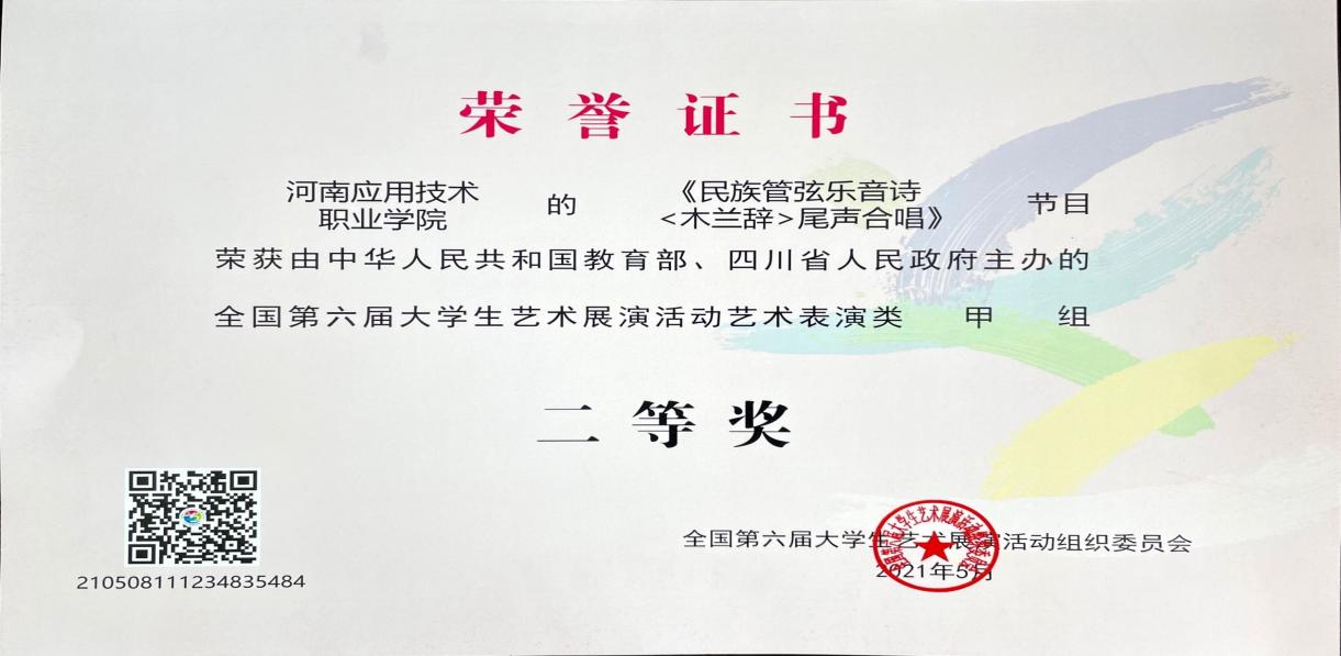 2021年5月18日,全国第六届大学生艺术展演活动再传喜报!经河南省教育厅评选推送,我校基础教学部王莹、刘琦两位老师率我校大学生艺术社团,在所指导的艺术表演类节目《民族管弦乐音诗<木兰辞>尾声合唱》荣获全国二等奖的好成绩,实现我校在历届大学生艺术展演中的历史性突破。
