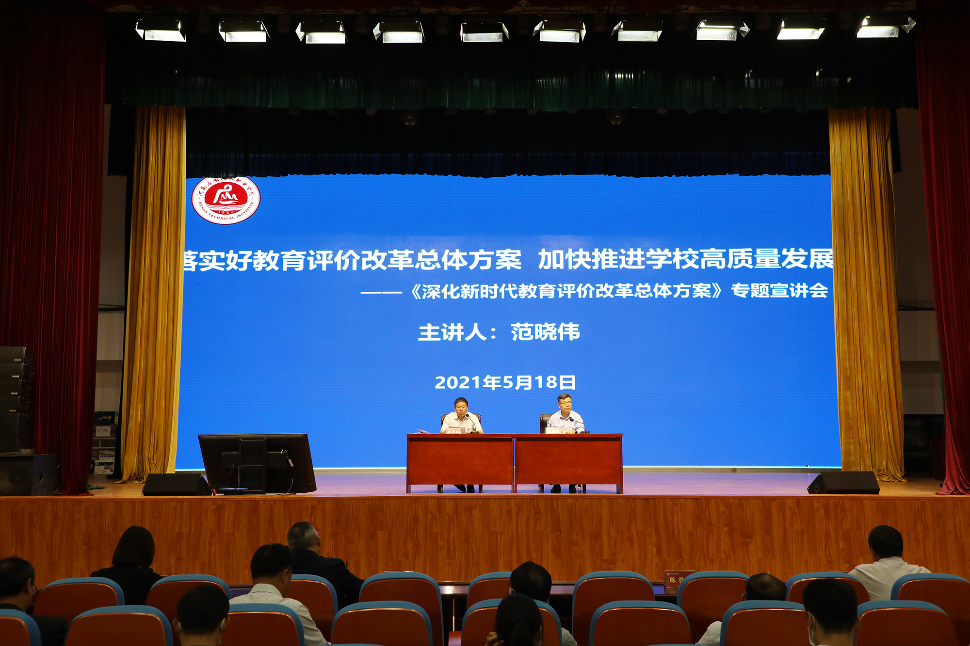 为深入贯彻落实习近平总书记关于教育的重要论述和全国教育大会精神,推进《深化新时代教育评价改革总体方案》(以下简称《总体方案》)落实落地,2021年5月18日下午,学校召开《总体方案》专题宣讲会,此次宣讲会由校长范晓伟主讲,党委副书记蒋清民主持,全体中层以上干部参加会议。