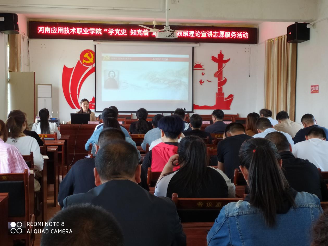 为进一步开展党史学习教育,深化河南省文明办、河南省教育厅、共青团河南省委《关于高校与新时代文明实践中心结对开展志愿服务工作方案》要求,落实“我为群众办实事”实践活动效果,2021年5月8日上午,我校党员志愿者来到南阳桐柏县月河镇,开展“学党史、知党情、跟党走”理论宣讲活动。基础教学部党总支副书记张振华以刘胡兰、焦裕禄和钟南山三位不同历史时期优秀共产党员的感人事迹,向月河镇政府的党员干部们介绍了在革命时期、建设时期和改革时期中国共产党人一以贯之的思想内核——坚定的理想信念、为大我甘愿牺牲小我的献身精神;以生动的语言、充沛的情感,诠释了中国共产党人的初心和使命——为中国人民谋幸福和为中华民族谋复兴;以回望百年的奋斗历程为导引,阐释了由红船精神、井冈山精神、长征精神、抗美援朝精神、焦裕禄精神、抗震救灾精神、劳模精神、抗疫精神等构筑起的中国共产党人的精神谱系。