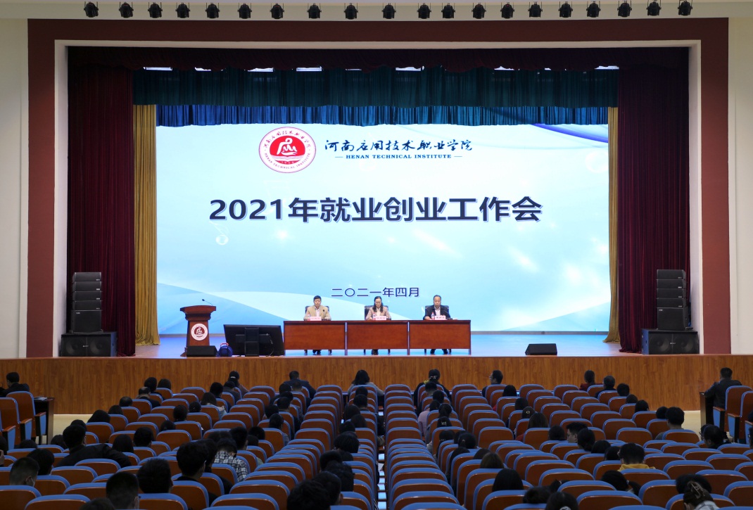2021年4月13日下午,我校在大礼堂召开2021年就业创业工作会议。副校长陈君丽、薄新党、刘振民出席会议,各二级学院党政负责人、就业专员、全体辅导员、班主任及相关职能处室负责人参加会议。会议由陈君丽主持。