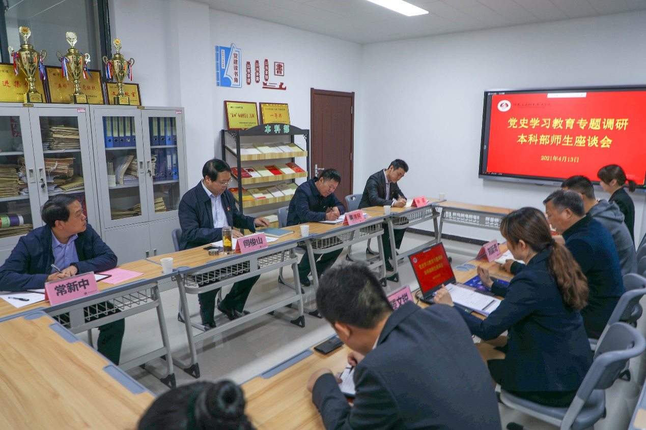4月13日,在全党上下认真贯彻习近平新时代中国特色社会主义思想,扎实开展党史学习教育之际,学校党委书记闫俊山在党委副书记蒋清民陪同下带领相关部门负责人,深入基层来到本科部开展“我为群众办实事”师生调研座谈。本科部全体教师、学生代表参加座谈会,会议由本科部主任刘新奇主持。