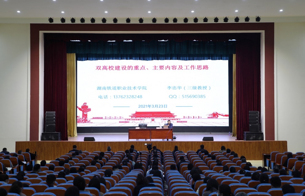 2021年3月23日下午,为进一步推进我校“双高工程”建设,不断提升人才培养质量,我校特邀请湖南铁道职业技术学院李忠华教授来校做“双高工程”暨“提质培优”专题培训。学校副科级及以上干部、副高级及以上职称教师、二级学院(部)教研室主任、专业带头人、高水平学校建设工程建设团队骨干教师代表参加会议。会议由副校长魏新华主持。