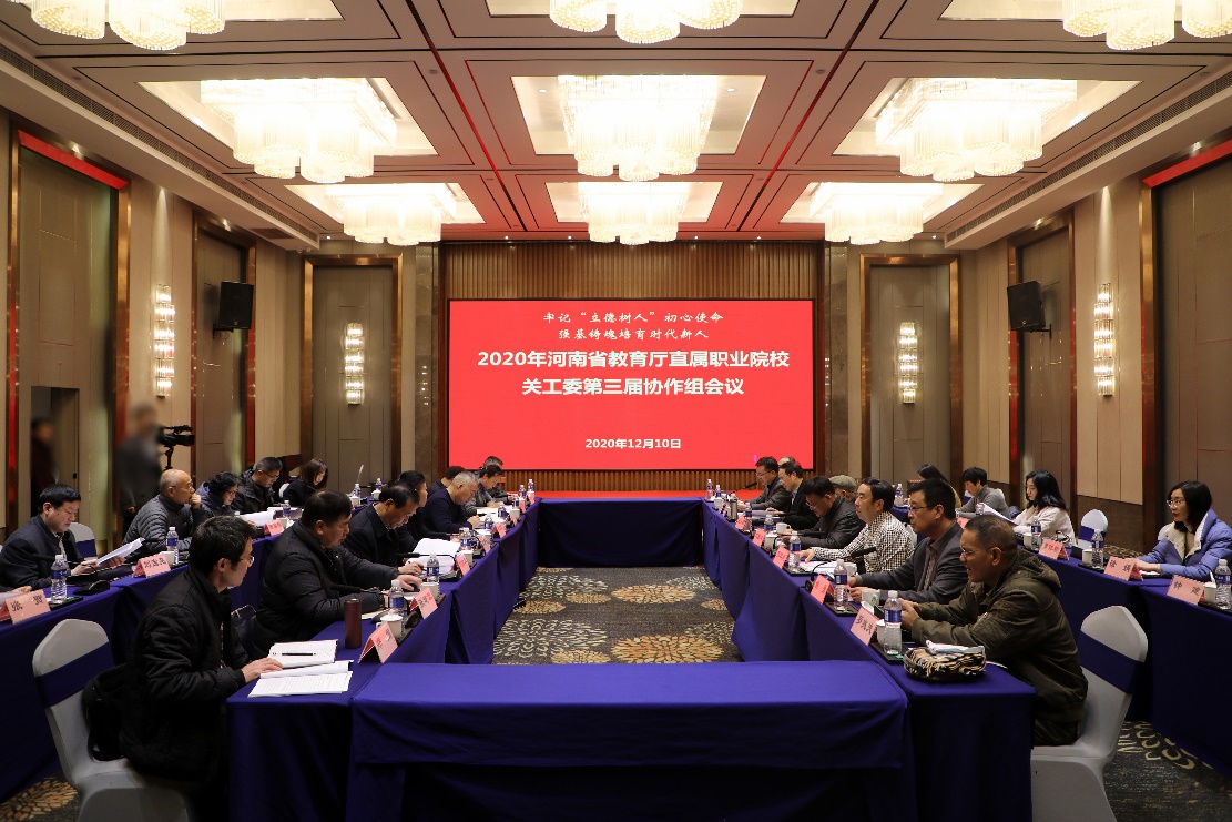 2020年12月10日,河南省教育厅直属职业院校关工委第三届协作组会议在我校顺利召开。河南省教育厅关工委主任王日新,副主任赵国河、董承明,副秘书长苏华龙、臧怀森、罗兆夫,我校校长范晓伟,党委副书记蒋清民、朱东方等领导出席了会议,12所厅直属职业院校的关工委负责同志参加了会议。