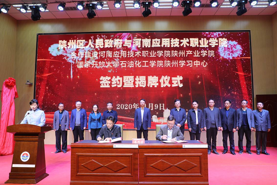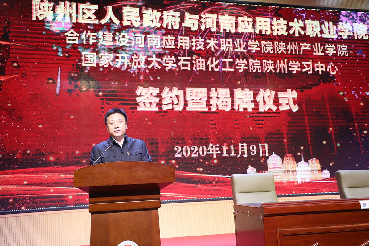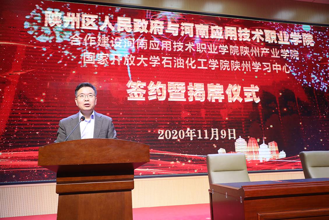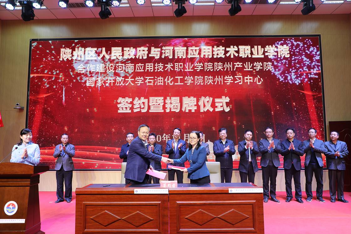 2020年11月9日上午,我院与陕州区人民政府合作建设陕州产业学院、国家开放大学石油化工学院陕州学习中心正式签约揭牌。我院党委书记秦书君,院长范晓伟,副院长陈君丽,陕州区委副书记、区长胡志权,陕州区人大常委会主任吴自力,陕州区政协主席潘新乐,陕州区副区长孙丽松等领导出席签约暨揭牌仪式。陕州区副区长孙丽松主持仪式。