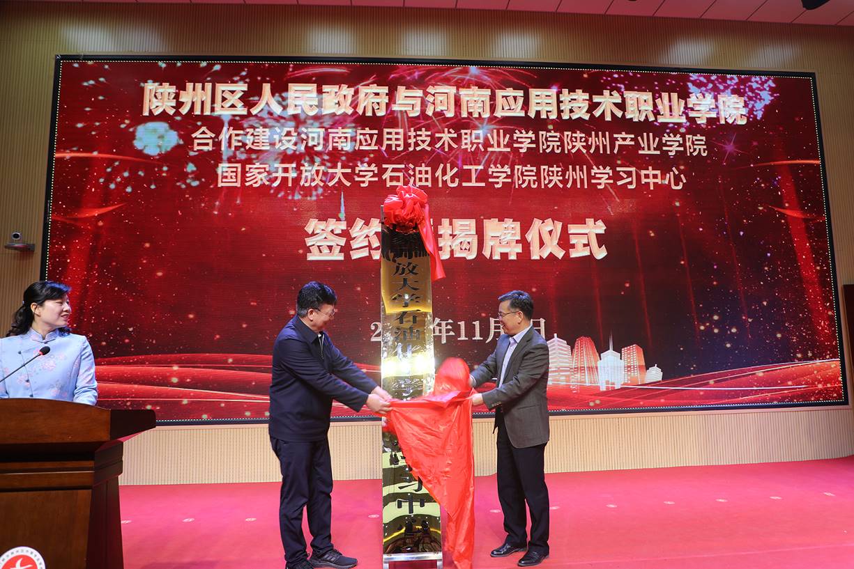 随后,秦书君和吴自力共同为“河南应用技术职业学院陕州产业学院”揭牌。范晓伟、胡志权共同签署了合作建设协议。范晓伟和潘新乐共同为“国家开放大学石油化工学院陕州学习中心”揭牌。陈君丽和刘建刚共同签署合作共建“3+2”五年制大专层次人才培养协议。