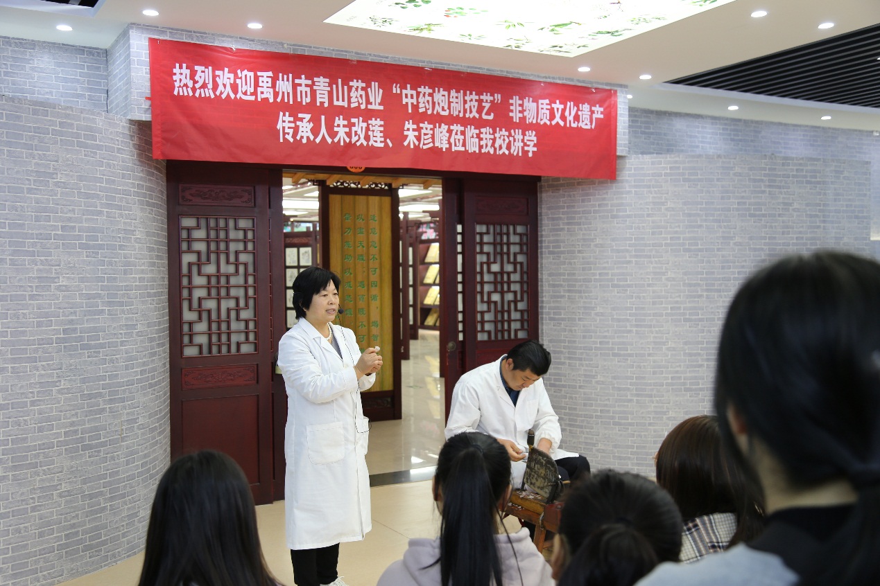 为弘扬中医药传统文化,丰富学生的中医药文化知识,感受大师精湛技艺,提高师生的中药炮制技能,2020年11月13日,我院邀请许昌市“中药加工炮制技艺”非物质文化遗产传承人朱改莲、朱彦峰进校园传艺。副院长陈君丽、医药学院院长韩宝来、医药学院党总支书记李明奇以及中药学教研室教师和中药学专业学生现场观摩学习。