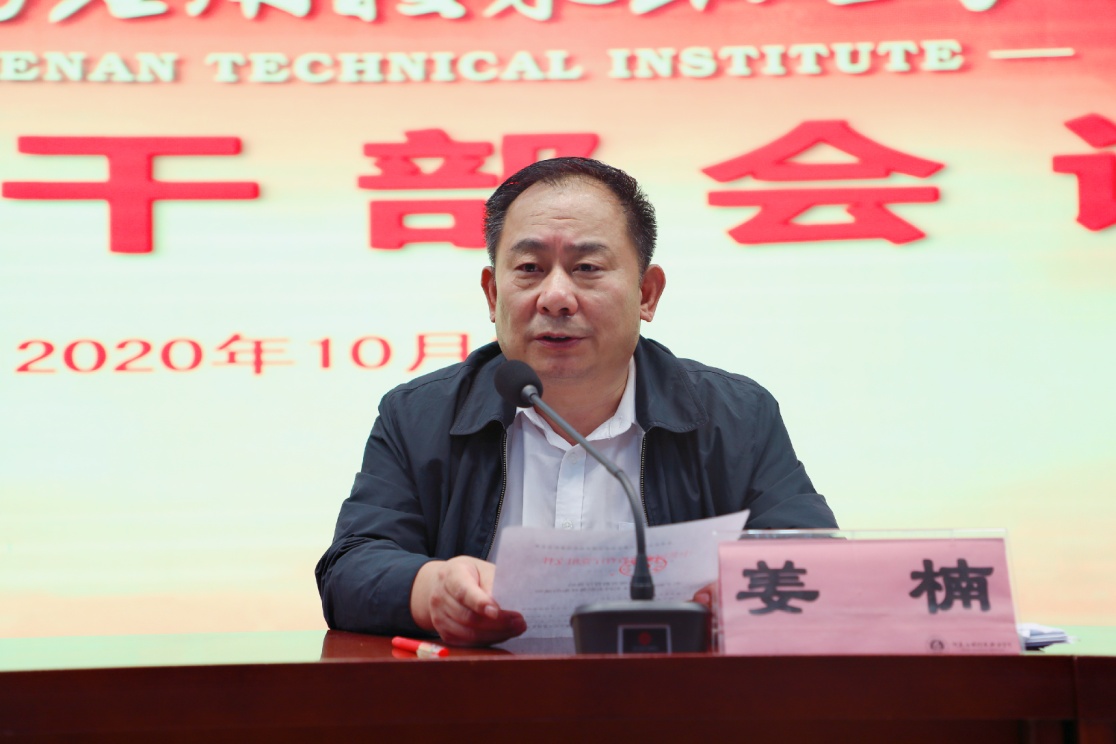 2020年10月9日下午,我院在实训中心二楼会议室召开干部大会,学院领导班子成员,中层干部及副高以上职称教师代表参加会议。河南省教育厅二级巡视员、人事处处长刘林亚,人事处一级调研员姜楠,职成教处一级调研员李永海莅临我校参加会议。院党委书记秦书君主持会议。姜楠同志宣读教育厅党组任命文件:魏新华同志任我院副院长,陈雅莉同志任我院纪委书记,刘振民同志任我院副院长。