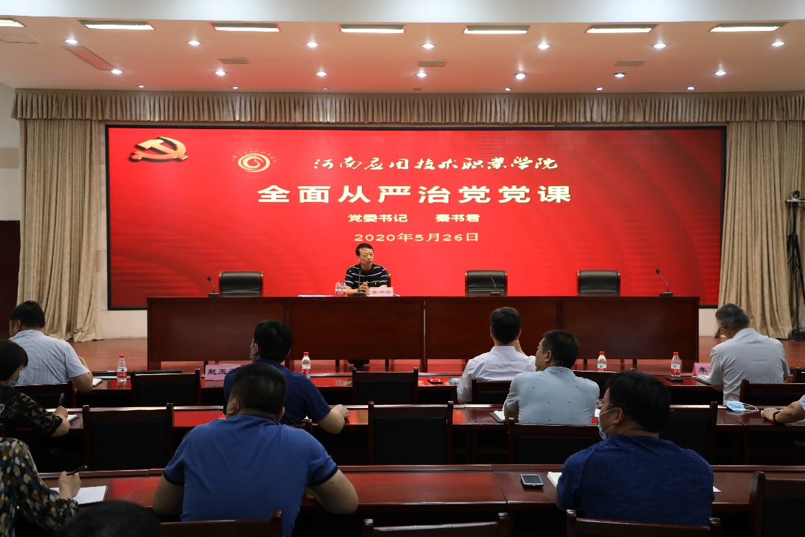 2020年5月26日下午,党委书记秦书君同志在我校实训中心二楼会议室,通过视频会议系统,以《落实党委领导,全面从严治党》为题为学校党员、干部讲了专题党课,生动阐述了新时代全面从严治党的重要性。