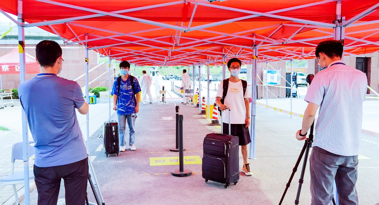 学生到达学生公寓后,保持1.5米间距排队接受检查。宿管人员会再次查验学生身份并测量体温,并对行李进行二次消杀。身份查验合格,体温检测正常后,学生有序进入寝室。