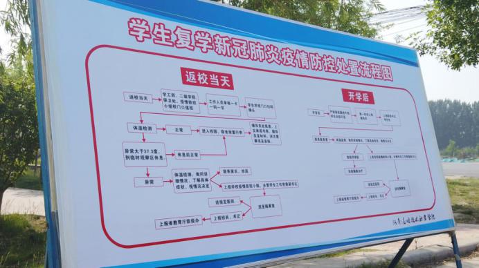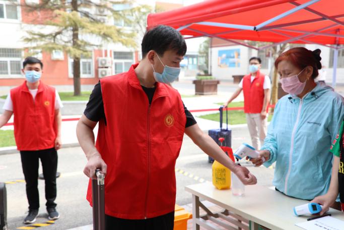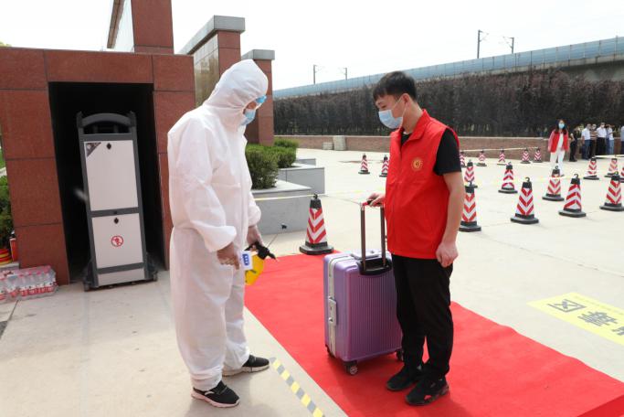 学生进宿舍都要先测量体温和用消毒液洗手,并对行李进行消毒。
