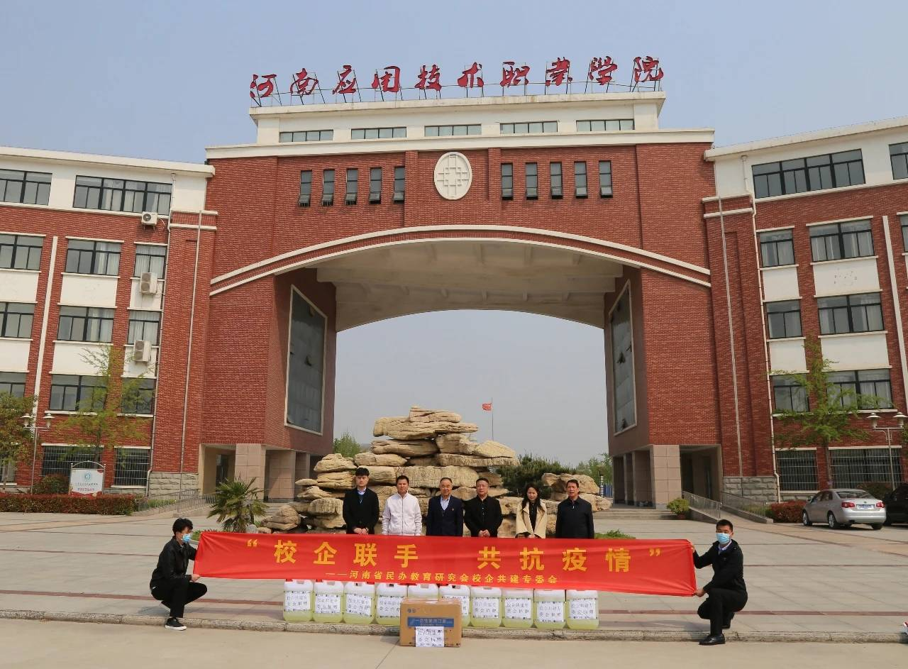 疫情无情,人间有爱。为保障学校开学前后的防疫抗疫工作顺利开展,2020年4月9日上午,河南省民办教育研究会校企共建专委会,委派河南饕客餐饮文化发展有限公司董事长曹大勇、河南天一文化传播股份有限公司研发总监权化臣、河南翰宇新能源技术有限公司市场开发总监卢明岳等代表,向我校捐赠500斤消毒液和2000只口罩。学校党委委员刘效平、后勤处副处长王保军出席仪式。捐赠仪式在东校区二楼会议室召开。