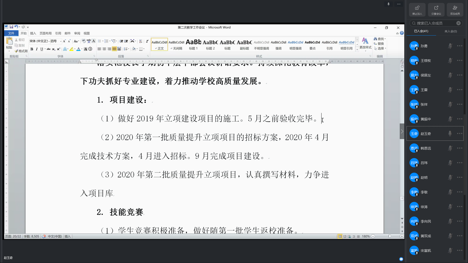 最后,副校长赵玉奇向各教学部门提出要求,及时召开本部门全体教师视频会议,传达本次教学工作会议的精神,通报问卷调查结果,提出对照改进要求,完善教师、学生健康状况与行踪档案,继续严格执行对顶岗实习学生管理的三项工作要求。