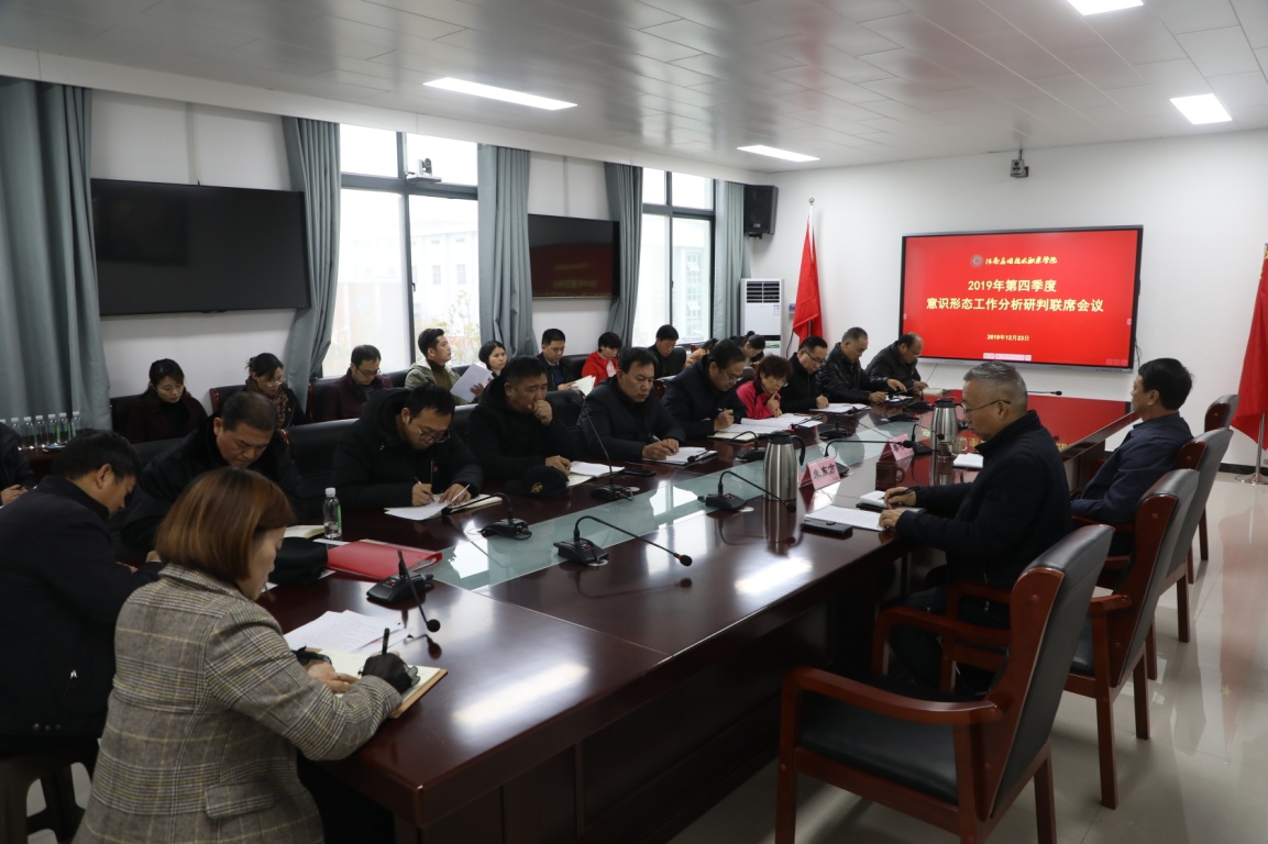 2019年12月23日上午,我校在办公楼三楼会议室召开全校意识形态工作分析研判联席会。党委书记秦书君、党委副书记朱东方出席会议,相关部门负责人、各二级院部党政负责人参加会议。党委副书记朱东方主持会议。