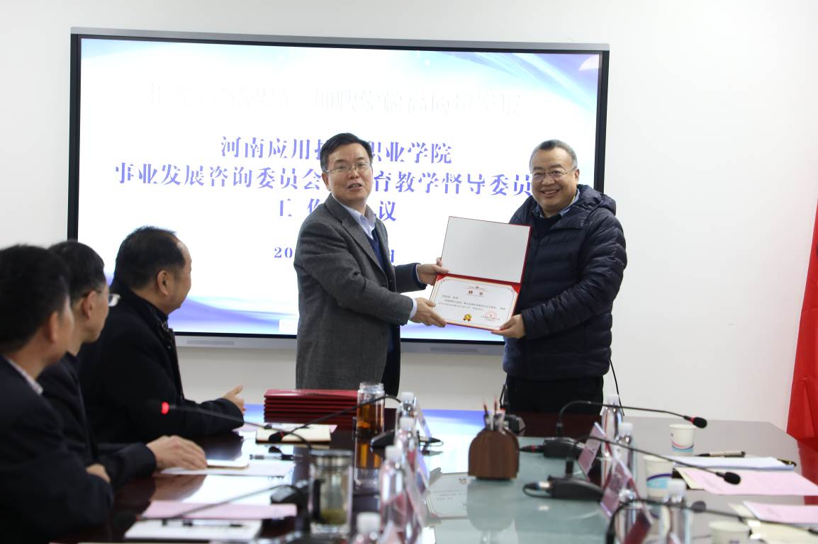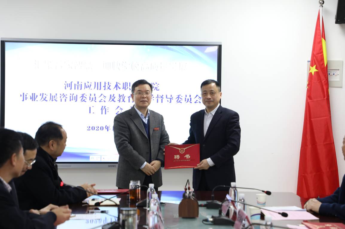 2020年1月10日下午,我校在办公楼三楼会议室召开事业发展咨询委员会及教育教学督导委员会工作会议,郑州大学副校长屈凌波教授、郑州大学化工与能源学院副院长任保增教授,河南经贸职业学院原校长苏万益教授,河南工业大学国际教育学院院长张浩军教授,“中原千人计划”教学名师、河南工业职业技术学院柔性制造河南省工程实验室主任韩全立教授应邀出席此次会议。我校校长范晓伟,党委副书记蒋清民、朱东方,副校长赵玉奇、陈君丽、薄新党、左智成及相关部门负责人参加会议。党委副书记蒋清民主持会议。