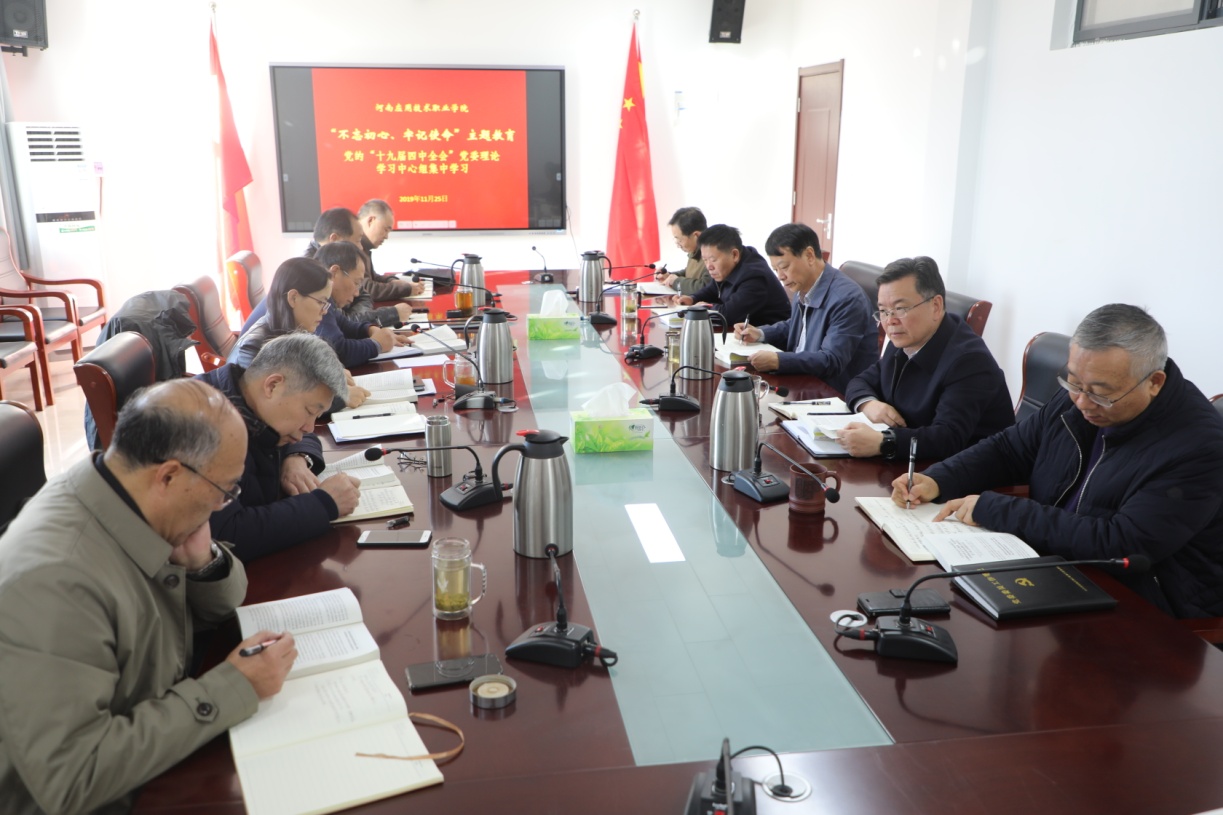 2019年11月25日上午,我校党委理论学习中心组全体成员在办公楼三楼会议室专题学习党的十九届四中全会出台的《中共中央关于坚持和完善中国特色社会主义制度、推进国家治理体系和治理能力现代化若干问题的决定》,相关部门负责人参加学习。