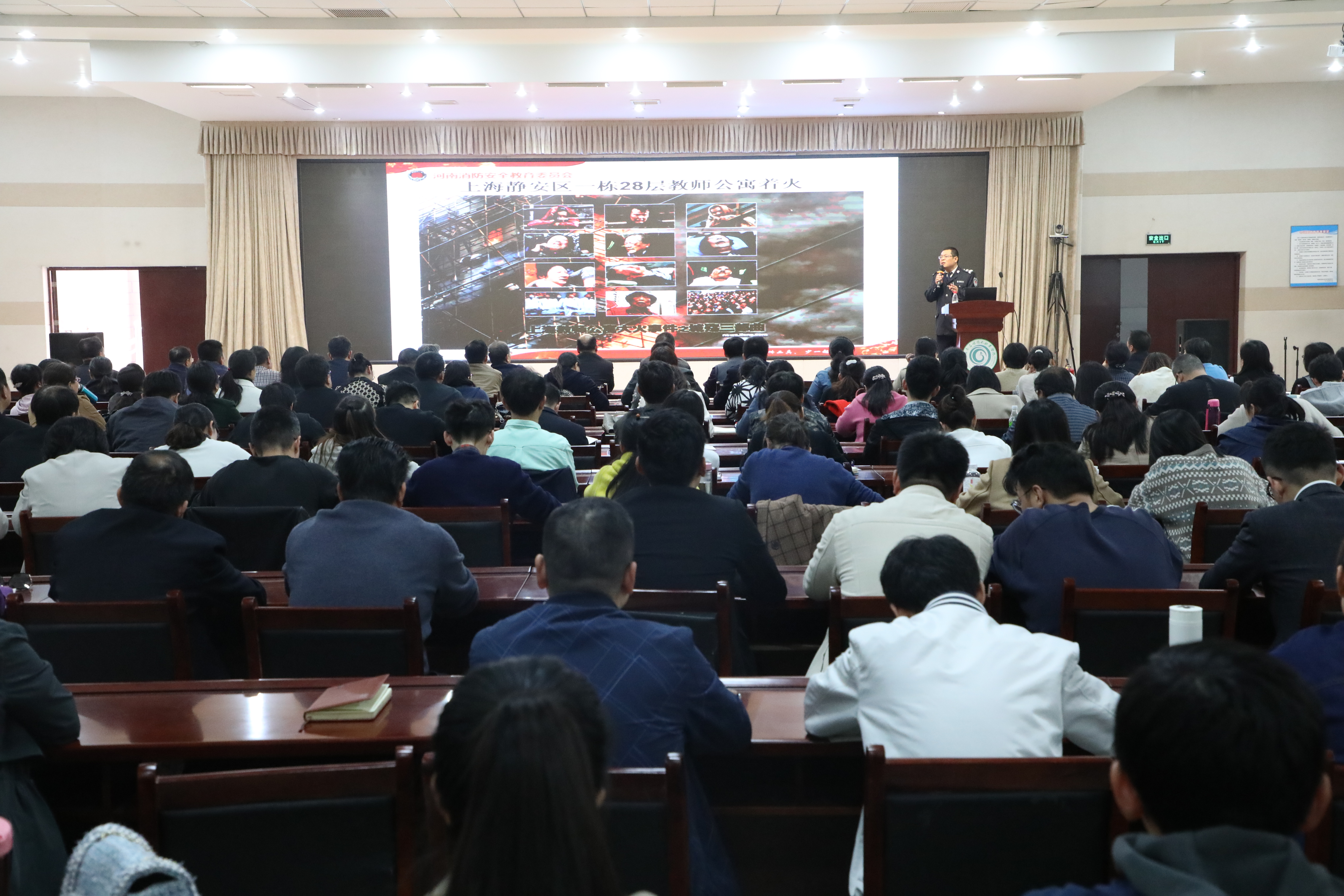 讲座中,陈教官针对学校消防安全工作的特殊性,以图文并茂、新闻报道、事故分析等多种方式讲解了近年全国全省发生的多起重大火灾事故,触目惊心的画面与数字让全体参训受到了极大震撼,深刻认识到了“隐患险于明火,防患胜于救灾”的重要性。