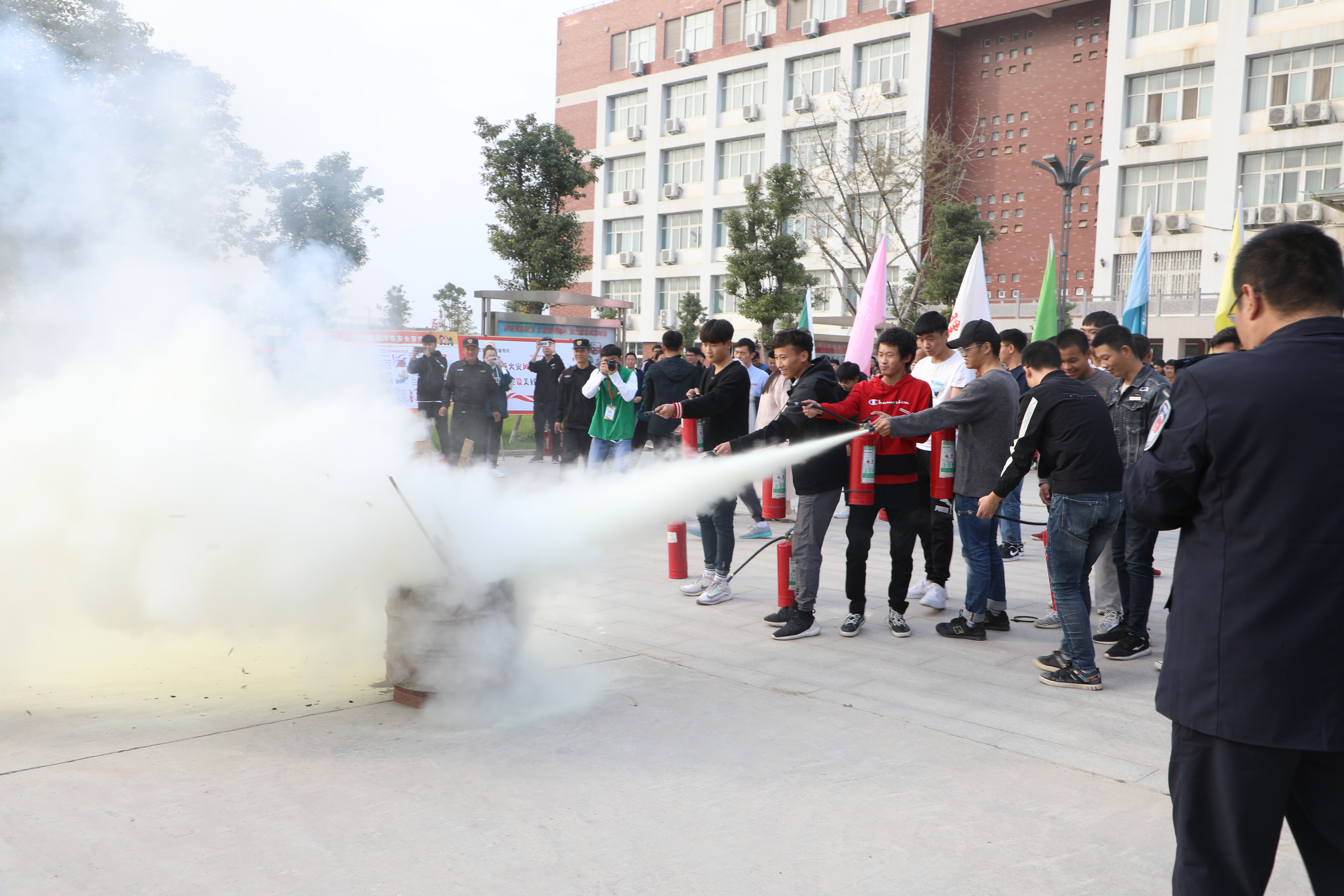 在演练现场,陈教官为大家展示灭火器的正确使用方法,确保在场的每位人员都能够正确使用灭火器。其后,大家根据要求进行了灭火演练。