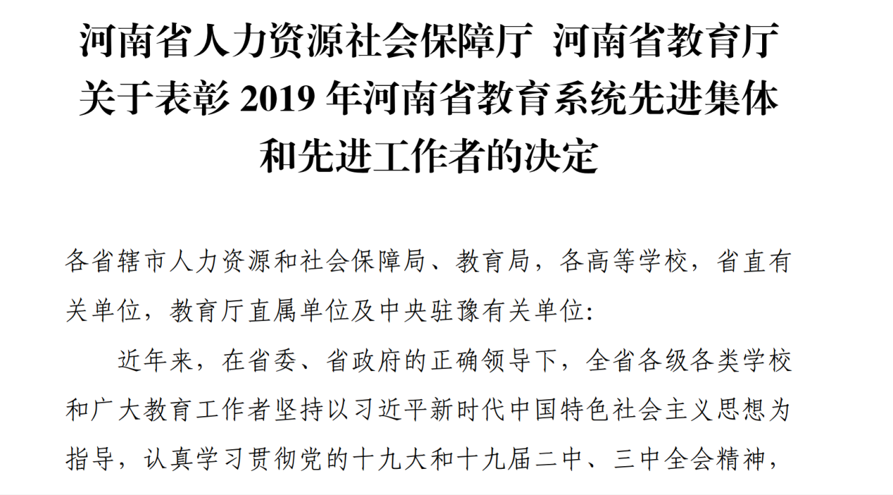 近日,省人力资源社会保障厅,省教育厅公布了关于表彰2019年河南省教育系统先进集体和先进工作者的决定,我校张青老师荣获2019年河南省教育系统模范教师荣誉称号。