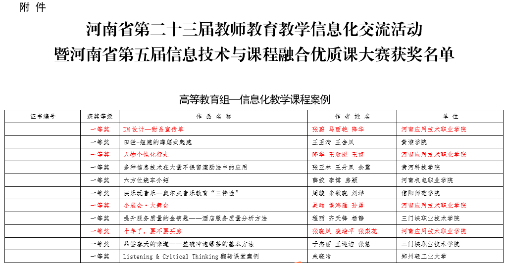 日前,河南省教育厅公布了第23届全国教师教育教学信息化交流活动暨河南省第五届信息技术与课程融合优质课大赛评选结果,我校张蔚、降华、吴昀、张晓凤四位老师作品获得了高等教育组“信息化教学课程案例”赛项一等奖;刘瑞红、米楠、左莉、柴芳芳、常昆、余斐斐六位老师作品获高等教育组“微课”赛项三等奖。