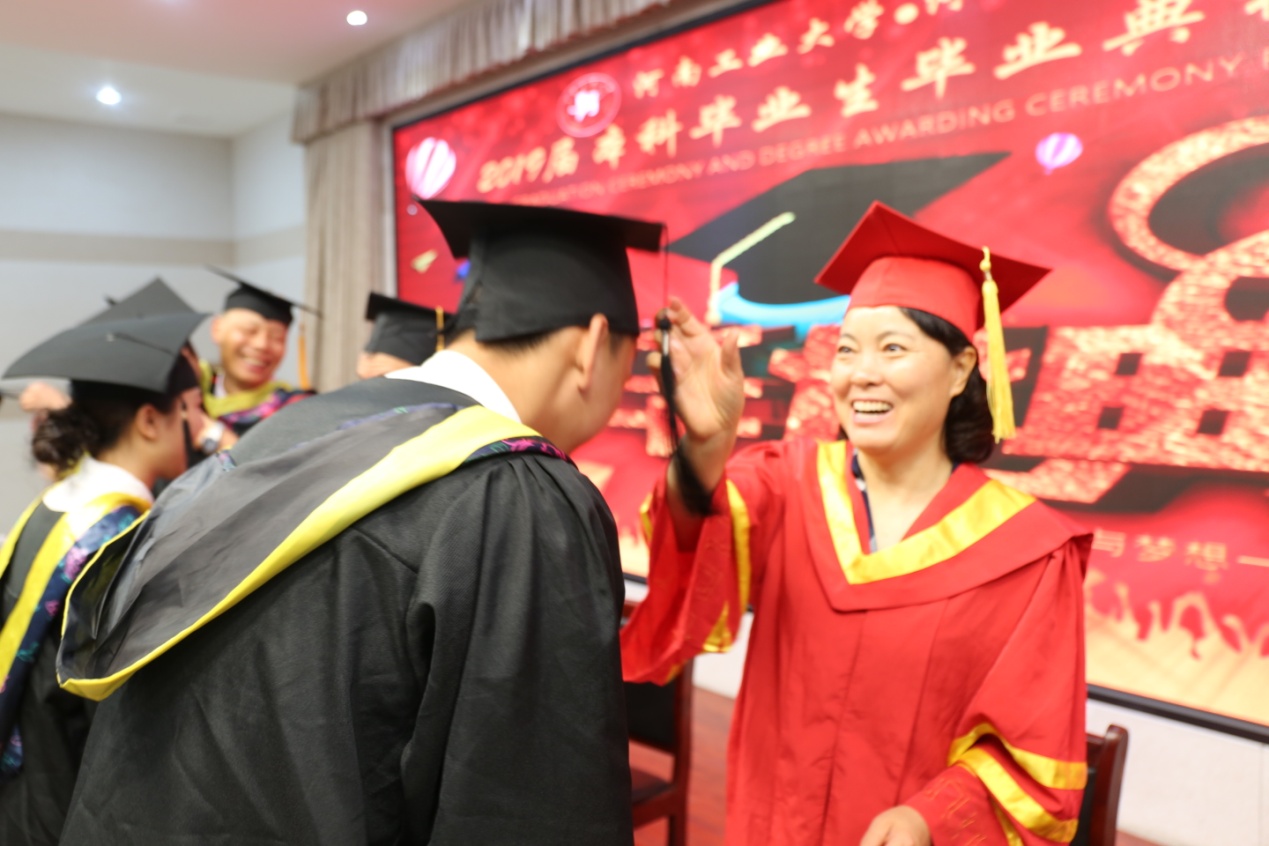 2019年6月21日上午,我校首届本科生毕业典礼暨学位授予仪式在实训中心二楼会议室隆重举行,87名毕业生顺利完成学业,即将踏上新的人生征程。河南工业大学副校长李利英,我校党委书记秦书君,校长范晓伟,党委副书记蒋清民,副校长赵玉奇、陈君丽,河南工业大学教务处副处长胡继云出席典礼。相关部门负责人及本科部全体师生参加典礼。副校长赵玉奇主持典礼。