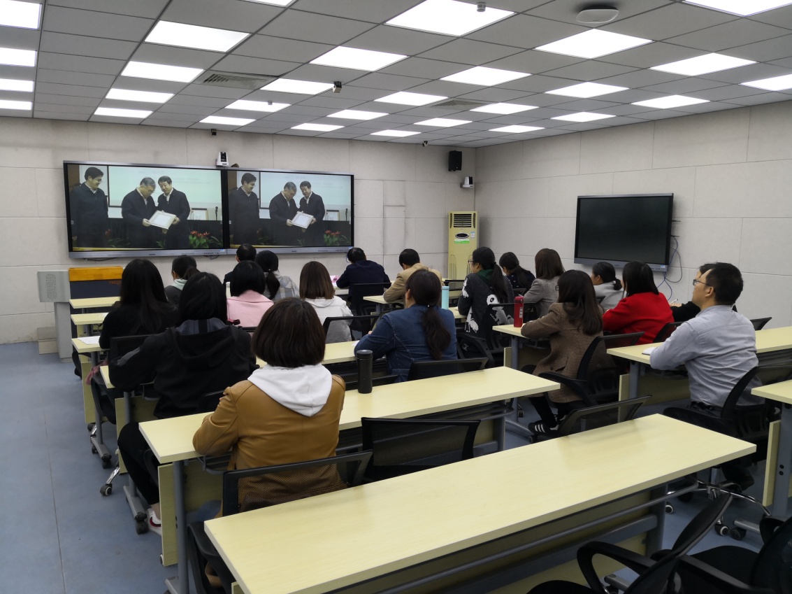 为深入贯彻落实习近平新时代中国特色社会主义思想,建设一支“政治要强、情怀要深、思维要新、视野要广、自律要严、人格要正”的高素质专业化思想政治理论课教师队伍,根据上级要求,2019年4月12日下午,学校党委副书记蒋清民、副校长赵玉奇与思政部教师及相关部门负责人在智慧教室集中收看了“周末理论大讲堂”开班仪式及第一讲。