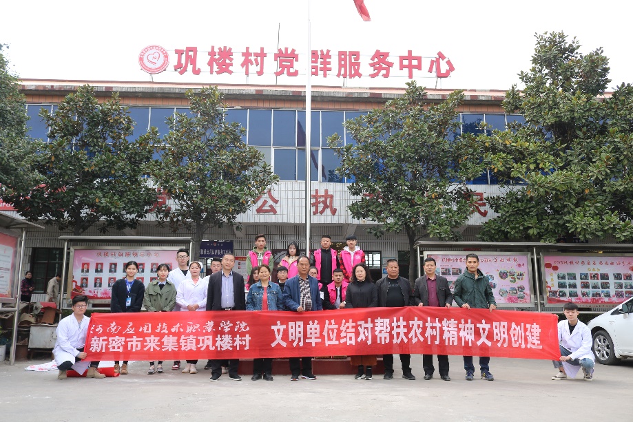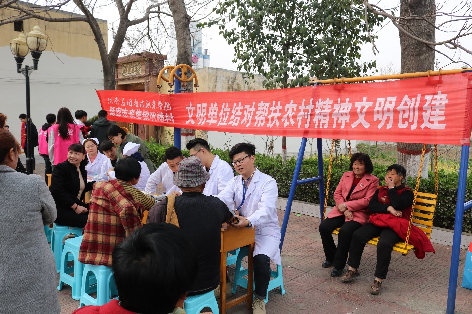 为践行社会主义核心价值观,弘扬志愿者服务精神,进一步促进农村精神文明建设,2019年3月22日下午,由我校精神文明建设办公室、机关第一党总支、护理学院党总支、商学院党总支组成的党员志愿服务队一行20余人来到了新密市来集镇巩楼村,为村民开展了党员志愿服务及免费义诊活动。