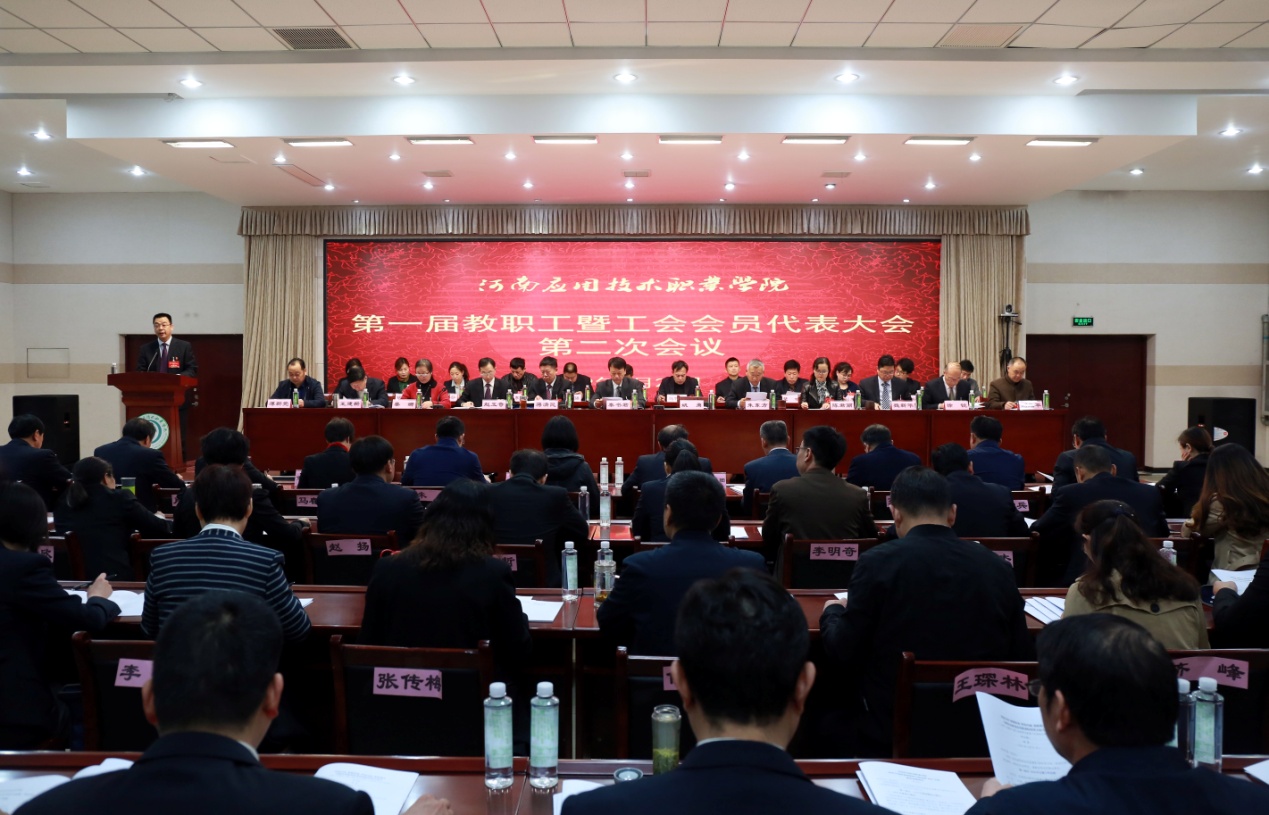 校长姚勇作了题为《党建引领 师德铸魂 深化内涵 狠抓落实 为建设高质量高等职业院校努力奋斗》的工作报告。报告对2018年以来学校在党的建设、立德树人、教育教学、学生管理、招生就业、产教融合、校园建设等方面进行了全面、客观的总结。明确了我校2019年工作主题为“师德师风建设年”。确立了高举中国特色社会主义伟大旗帜,以习近平新时代中国特色社会主义思想为指导,坚持和加强党对教育工作的全面领导,坚持高质量发展,将学校建成“办学理念先进、体制机制创新、规模结构合理、人才培养一流、服务能力显著”的新时期高质量高等职业院校的总体思路,并对2019年学校主要工作进行了部署。