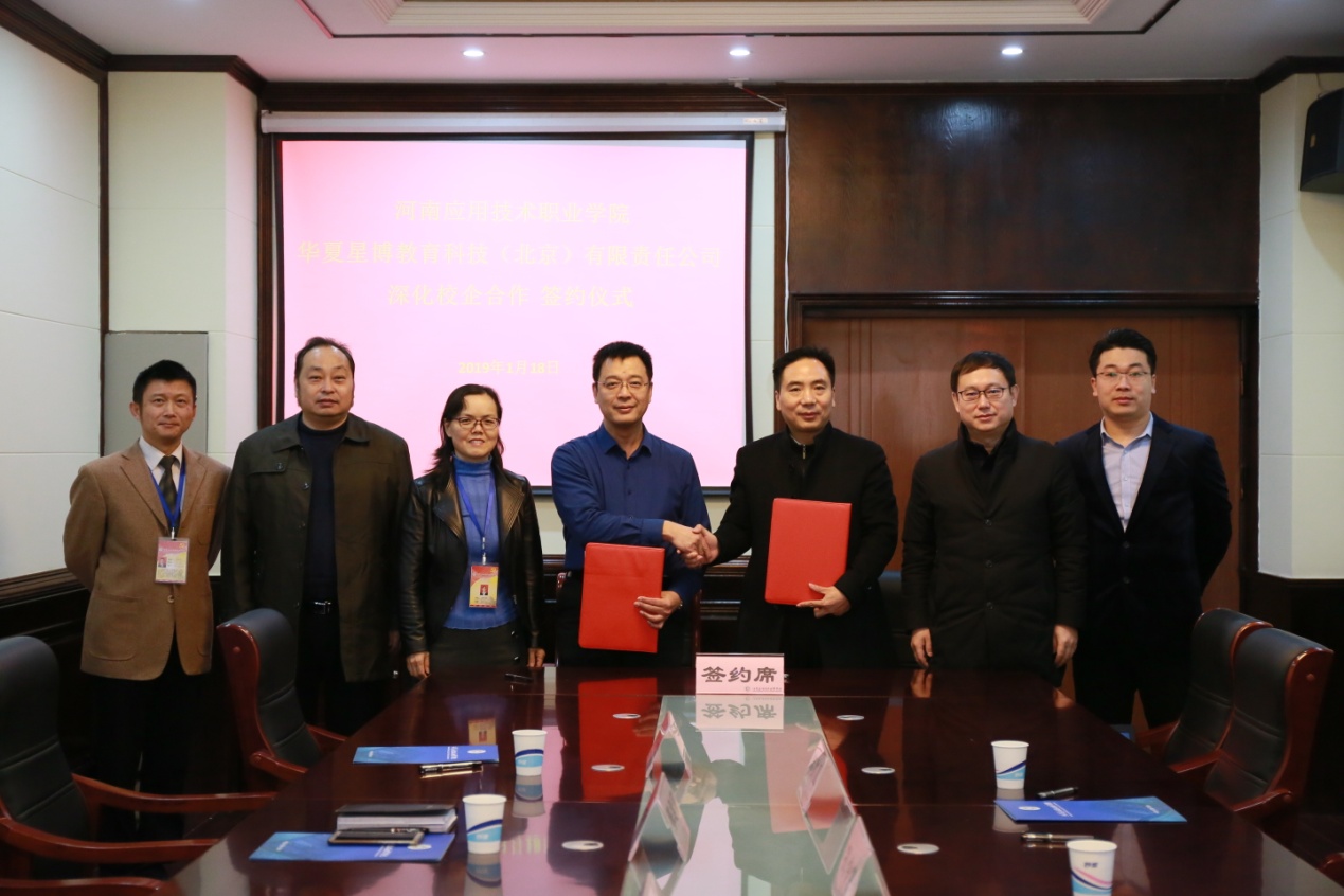 2019年1月18日上午,我校与华夏星博教育科技(北京)有限责任公司校企合作签约仪式在实训中心三楼会议室举行,校长姚勇,副校长陈君丽、薄新党,华夏星博教育董事长孔令伟,华夏星博教育董事、河南国基建筑装饰有限公司董事长付咏,华夏星博教育副总经理韩帅星出席仪式。
