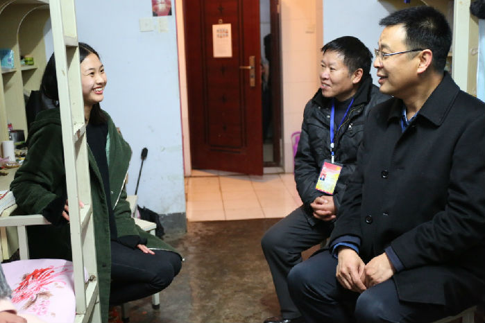 2018年3月4日是我校学生返校之日,晚上7点,党委副书记、院长姚勇,党委副书记蒋清民在相关部门人员的陪同下,视察了校内宿舍楼及部门宿舍的环境安全情况,并对返校同学给予了热情的关心和慰问。