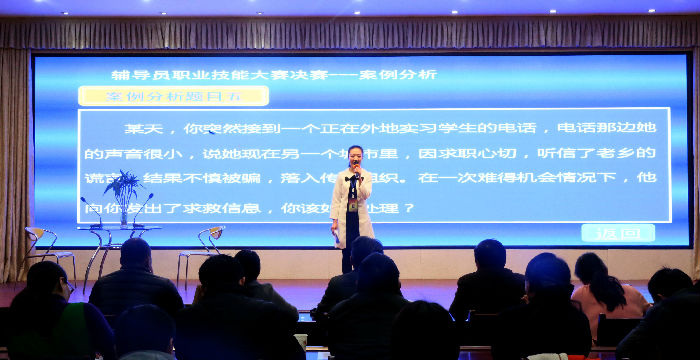经过初期预赛,共有11位辅导员进入到了本次决赛。决赛共分为“案例分析”、“谈心谈话”、“主题演讲”三个环节,主要考察辅导员基础理论知识、综合知识运用、分析解决问题能力、语言沟通能力、创新思维等日常工作中所具备的基本职业素养。在案例分析环节,11位选手个个思维缜密,分析入情入心,合法合理;在谈心谈话环节,选手们沉着应对,针对学生遇到的困惑晓之以情,动之以理;在主题演讲环节,选手们声情并茂,或慷慨陈词,或委婉深沉,充分展示了我校辅导员队伍精湛的职业能力与良好的职业素养,赢得了台下评委和观众们阵阵掌声。