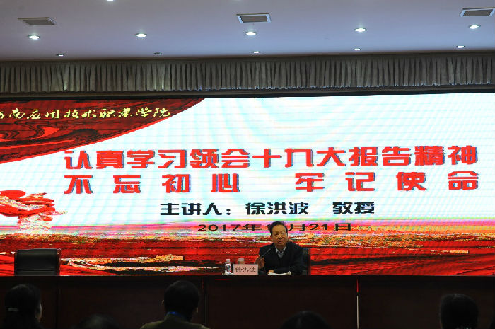 报告会上,徐洪波教授以《认真学习领会党的十九大报告精神,不忘初心,牢记使命》为主题,从三个方面阐述了党的十九大精神。他说,当前全社会兴起学习、贯彻、颂扬党的十九大精神的热潮。这主要是因为从历史和现实生活中,越来越多的人感受到,党的十九大不仅是党的大事,也是人民的大事、民族的大事。一要深刻领会党的十九大的意义。党的十九大是在全面建成小康社会决胜阶段、中国特色社会主义进入新时代的关键时期召开的一次十分重要的大会,是一次在新的历史起点上开启党和国家事业新征程的大会,是一次不忘初心、牢记使命、高举旗帜、团结奋进的大会。党的十九大报告是党的十八大以来我们党伟大实践和理论创新的结晶。要着重认清时间意义、理论意义和政治意义;二要深刻认识和把握十八大以来党和国家事业取得的历史性成就和实现的历史性变革,深刻领会中国特色社会主义进入新时代,深刻认识和把握我国社会主要矛盾发生变化的重大判断,深刻领会新时代赋予我们新的使命;三要把思想和行动统一到党的十九大精神上来,推动我们的各项工作取得更大的发展进步。