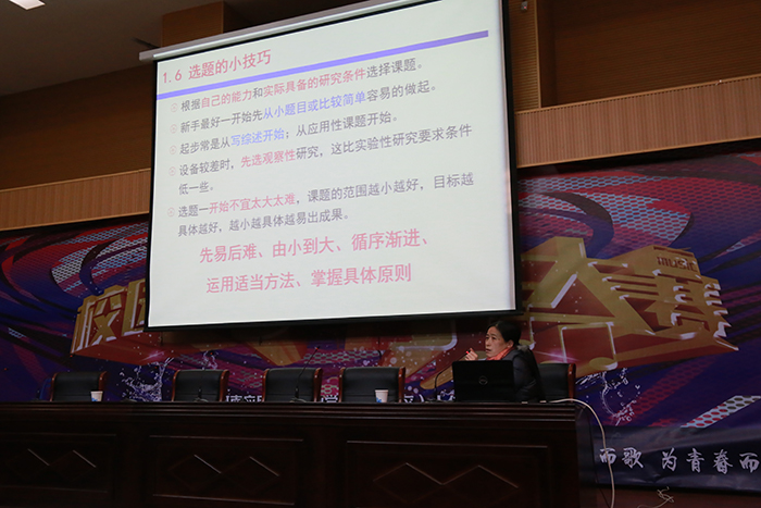 柴教授结合自己多年科研工作经验,从三个方面深入浅出的阐述了高校科研课题选题、开题和结题的技巧与特点。她指出科研工作要先易后难、由小到大、循序渐进,强调课题立项依据是科研工作的关键,研究方案是课题设计的重中之重。柴教授用结合实际、深入浅出的讲解,让与会人员受益匪浅。