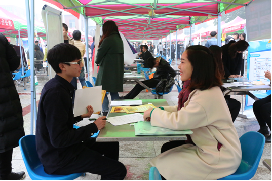 开幕式后,招聘会正式开始,各用人单位早已架起招聘宣传牌,罗列出招聘岗位、专业要求、薪资待遇等。面对众多招聘单位与就业信息,我院毕业生们则表现得成熟稳妥,他们多方浏览,对比遴选,挑选适合自己的岗位,积极与用人单位进行交流。