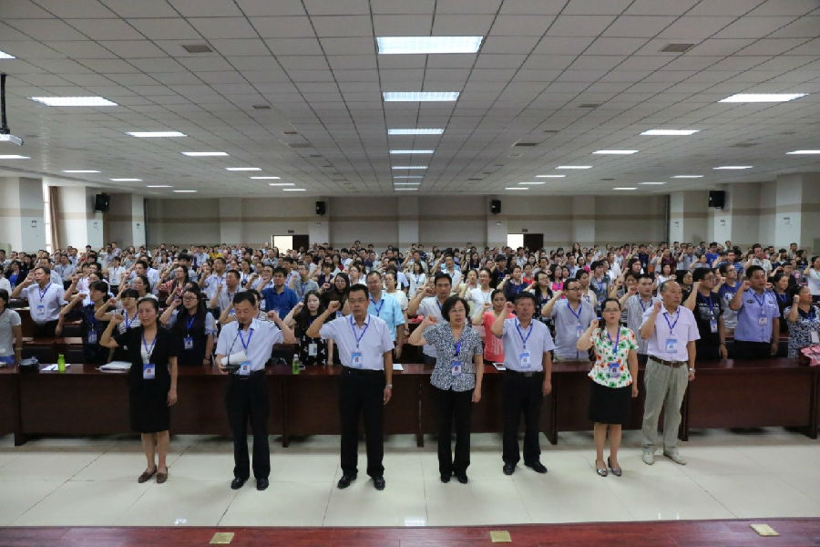 大会首先进行了庄严的教师宣誓仪式,全体教职员工举起右手庄严宣誓:我志愿做一名光荣的人民教师,忠诚人民教育事业,贯彻党的教育方针。爱国守法,敬业爱岗;教书育人,关爱学生;传承文明,勇于创新;严谨治学,启智求真;为人师表,乐于奉献。为实现中华民族的伟大复兴而努力奋斗。