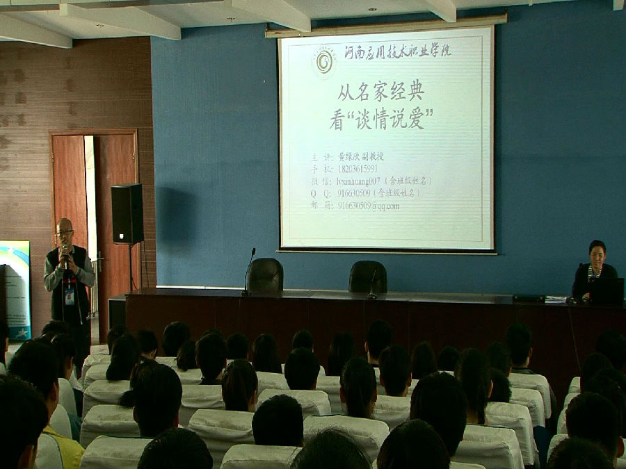 黄教授以“从名家经典看谈情说爱”为主题,从世界观、人生观、价值观三方面来引导学生正确看待爱情,认识爱情在生命中的价值和意义。其次,她又以周总理的八字爱情观(“互敬、互爱、互谅、互让”)为引导,详尽阐述了爱情的真正涵义。最后,黄老师提醒广大学生,中国素称礼仪之邦,提倡“非礼勿视,非礼勿听,非礼勿言,非礼勿动”的传统礼仪,因此情侣们在公共场所要“发乎情止乎礼”,尊重他人,尊重习俗,在行驶自己恋爱权利的时候,不要忘记遵守基本的社会公德。