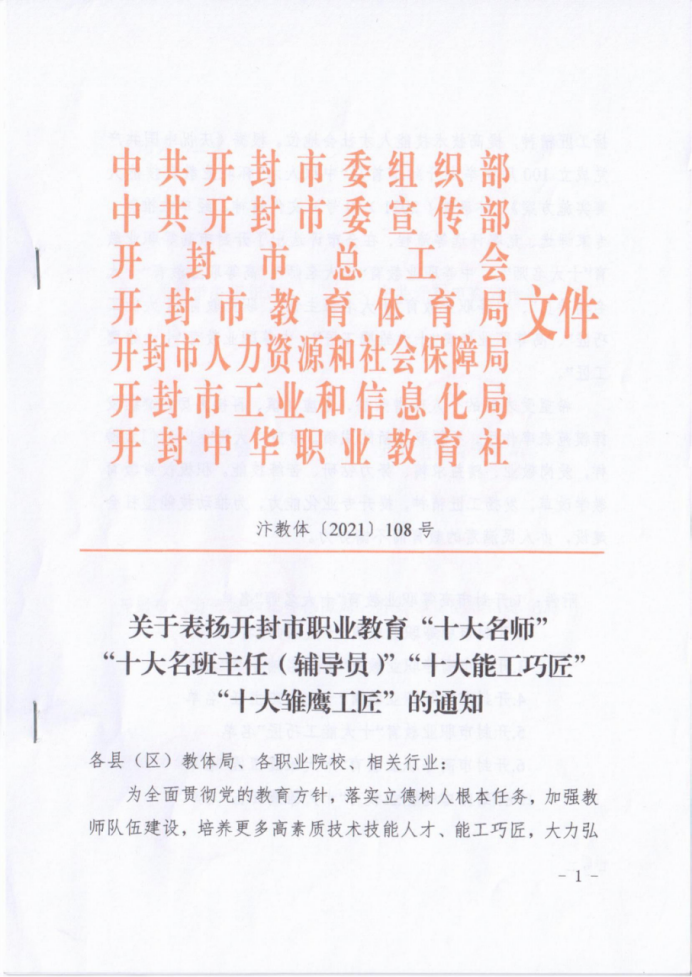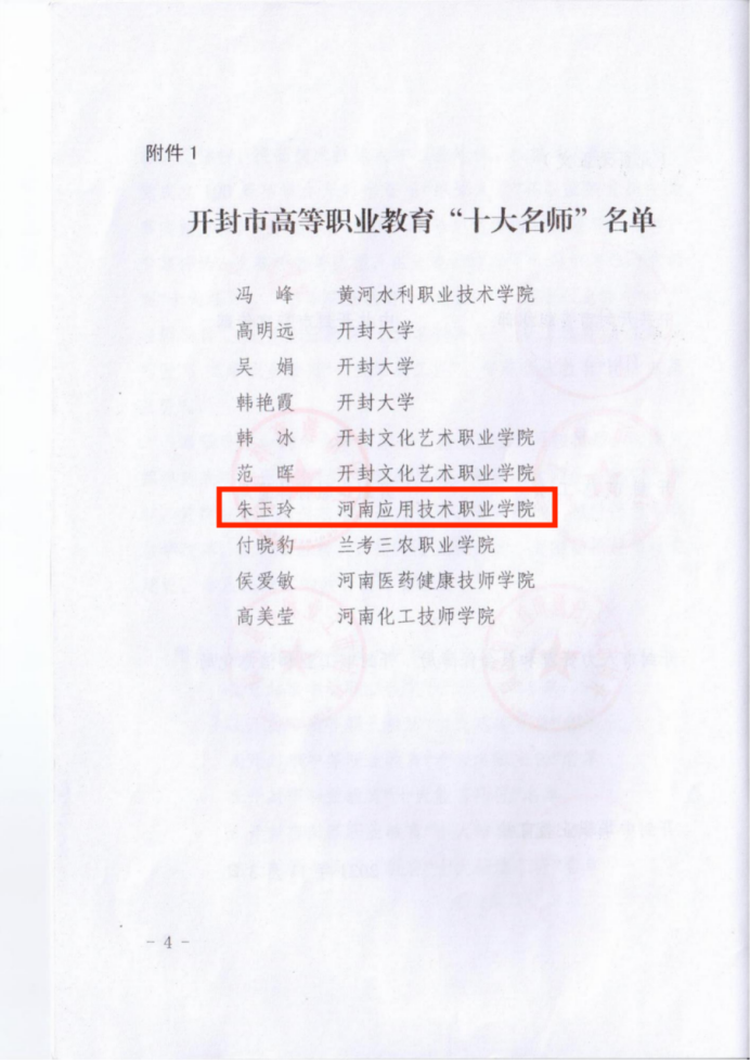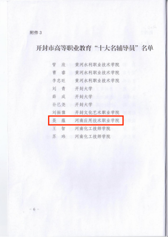 2021年12月16日,由中共开封市委组织部主办、开封市教育体育局承办的首届“中原人才”杯职业教育技能大赛颁奖仪式在汴梁小宋城举行,我校制药工程学院朱玉玲和经济管理学院聂蕴分别荣膺开封市高等职业教育“十大名师”和“十大名辅导员”。