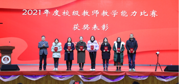 参会校领导为2021年度校级教师教学能力比赛、校级青年教师课堂教学创新大赛、校级青年教师基本功比武大赛获奖教师表彰和颁奖。