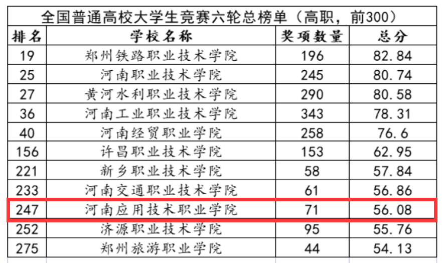 2022年2月22日,中国高等教育学会高校竞赛评估与管理体系研究工作组发布2021全国普通高校大学生竞赛分析报告,其中包含本科院校大学生竞赛榜单13个、高职院校大学生竞赛榜单10个、省份大学生竞赛榜单3个。我校位列全国普通高校大学生竞赛第六轮总榜单(高职)第247,河南地区排名第9。