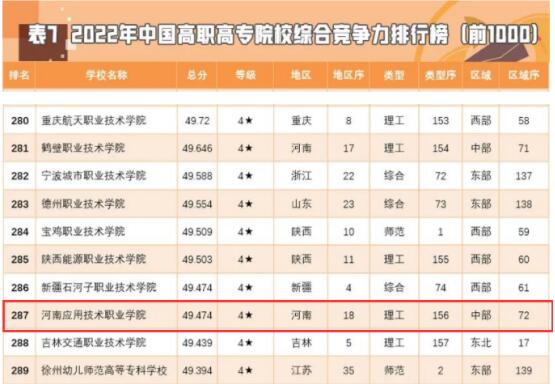 2022年3月16日,“金平果”2022年中国高职高专院校综合竞争力排行榜(前1000)发布,我校排名全国第287、河南省第18。与2021年榜单相比,今年我校全国综合排名上升106位,全省排名上升10位,均创历史新高。
