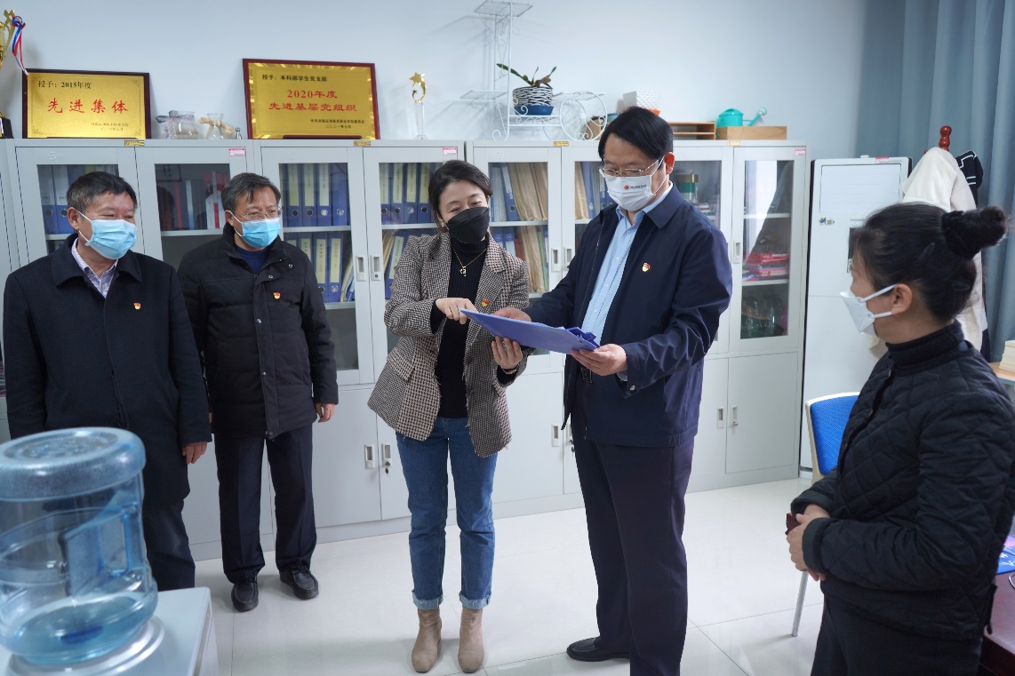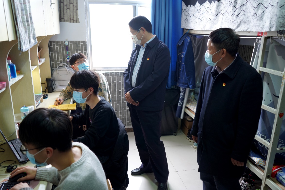 3月31日,闫俊山一行走访了本科部和学生宿舍,深入了解二级院部教育教学、疫情防控、师生精神面貌和心理状态等,勉励教职工振奋精神、坚定信心、防控履责、携手前行,认真做好线上教学、学生生活保障和心理疏导等工作;鼓励学生树立防疫信心,保持良好心态,积极配合学校疫情防控工作,不信谣、不传谣。